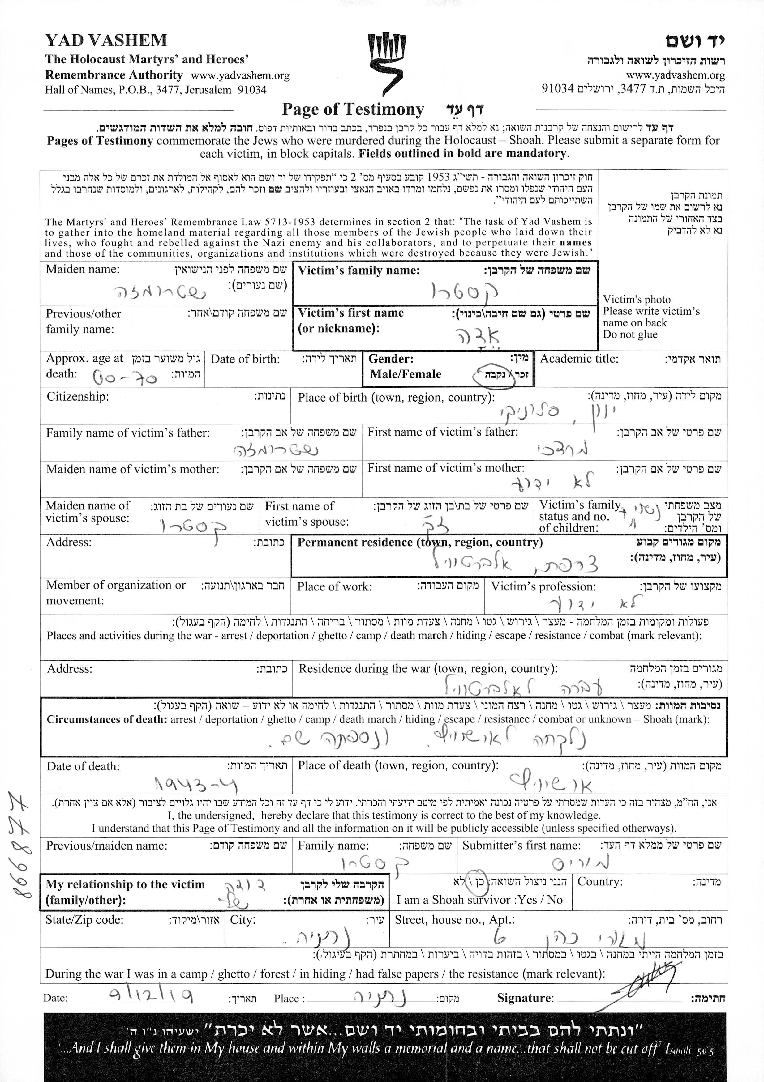 | Castro | Eda | Albertville, France | Feuille de témoignage | |