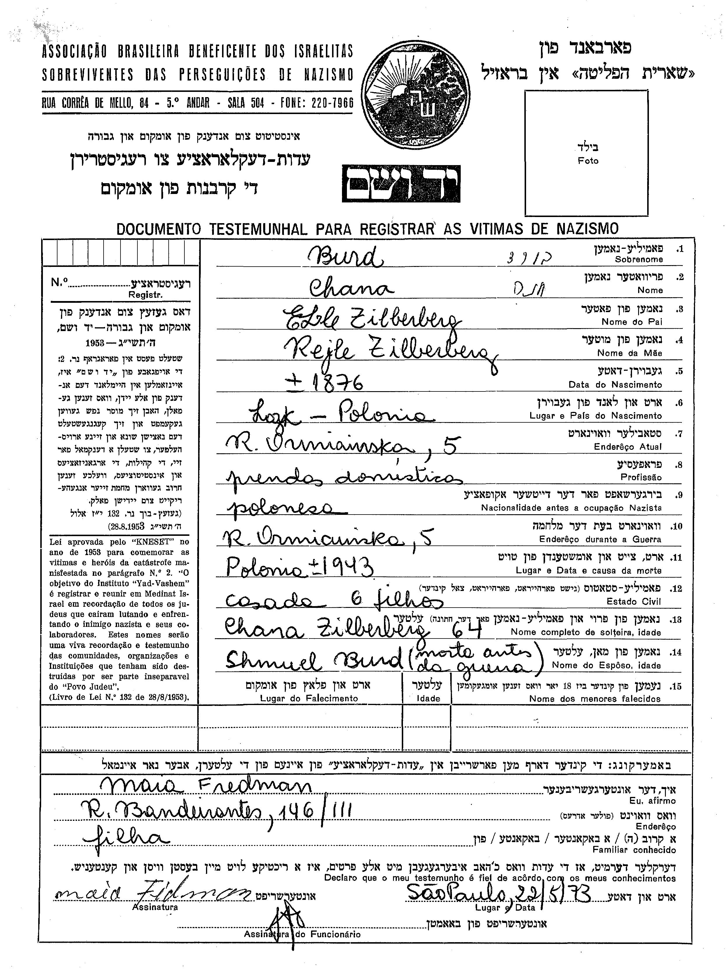 Chana Burd née Zilberberg est née à Lock, Pologne en 1876, fille de Rejle. Elle était Femme de ménage et Mariée à Shmuel. Avant la seconde guerre mondiale elle vivait à Lock, Pologne. Pendant la guerre, elle était à Lock, Pologne.
