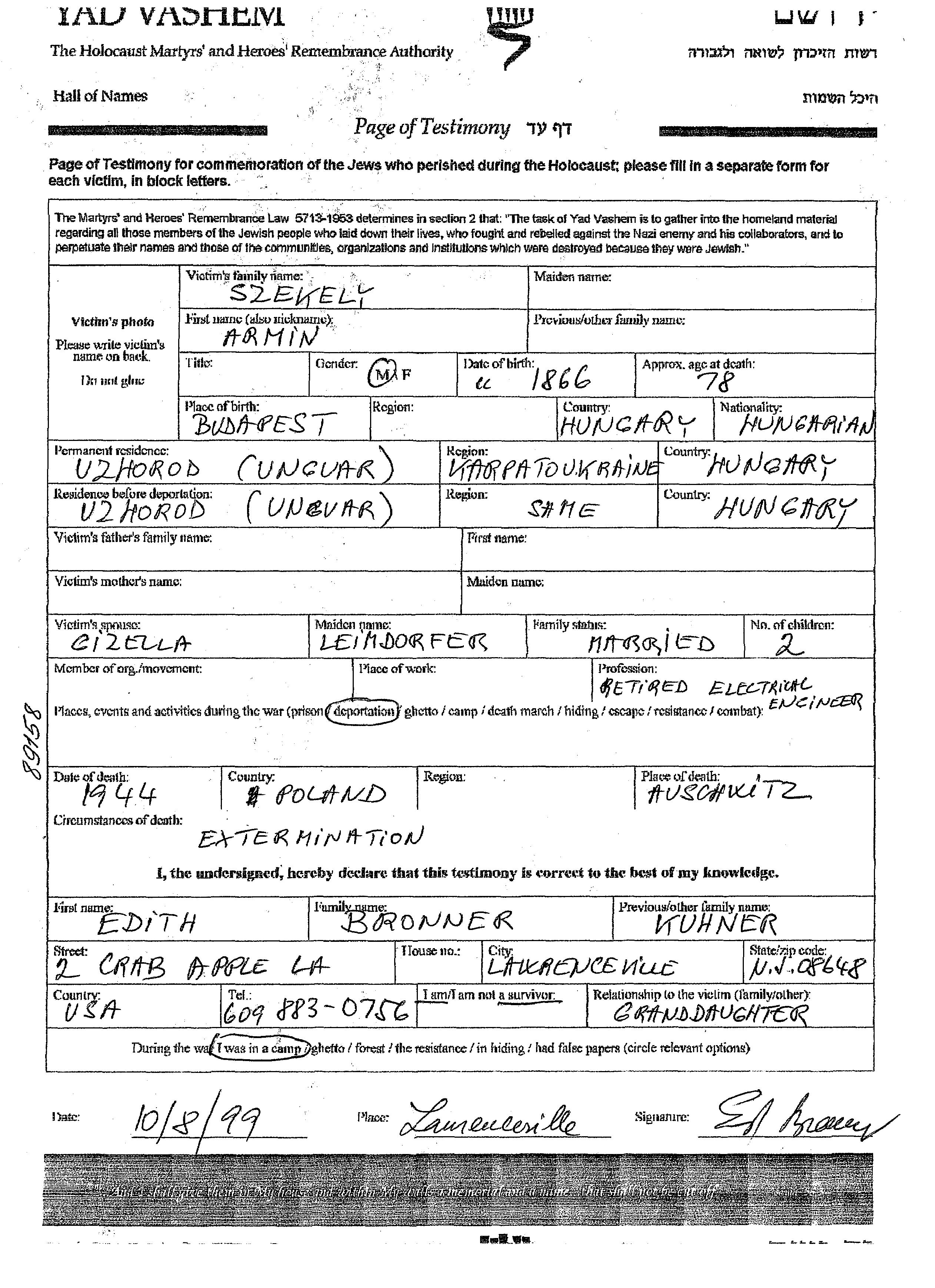 Szekely Armin 1866 Uzhorod, Tchécoslovaquie Feuille de témoignage