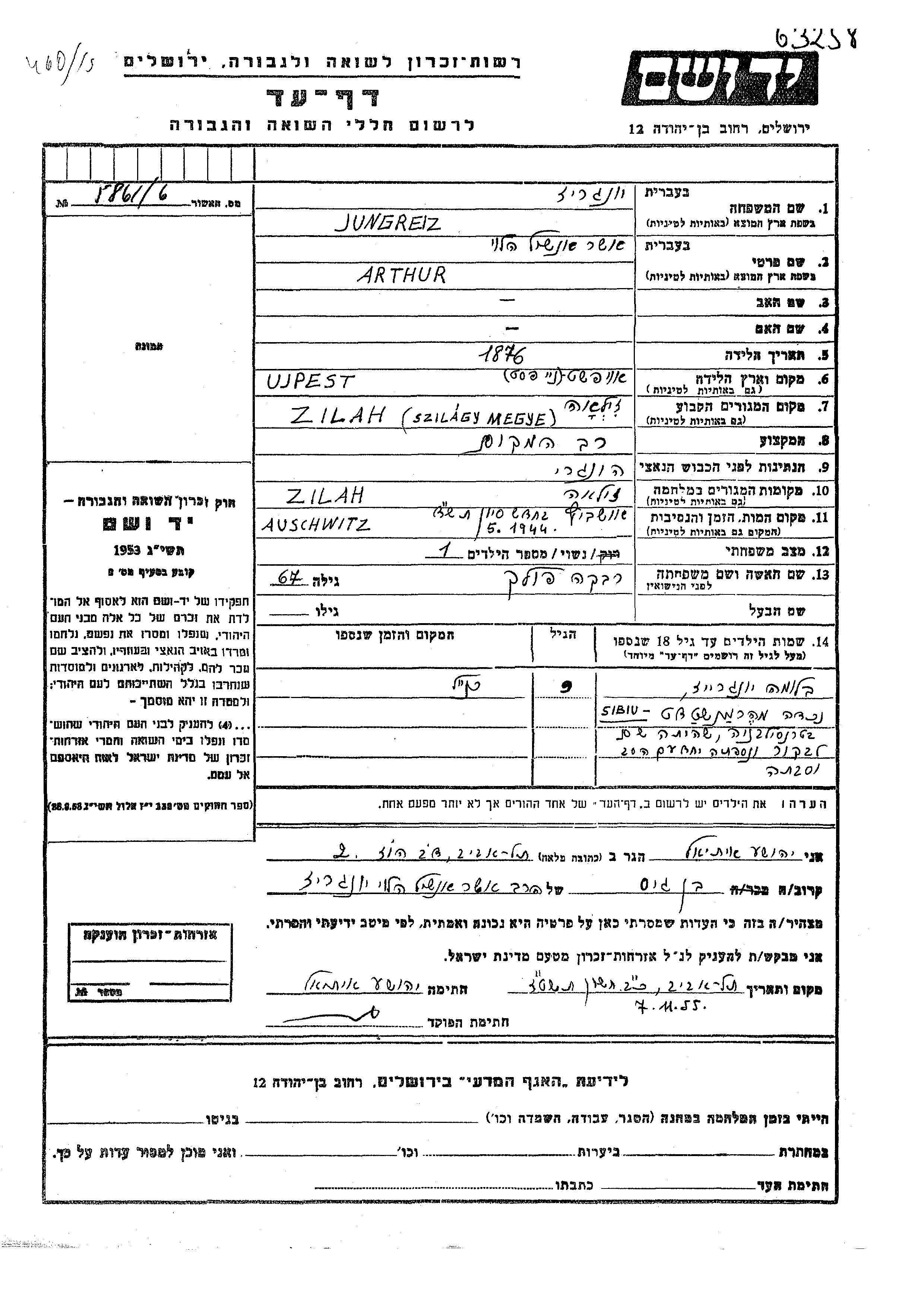 Jungrajs | Artur | 1885 | Zilah, Roumanie | Feuille de témoignage |