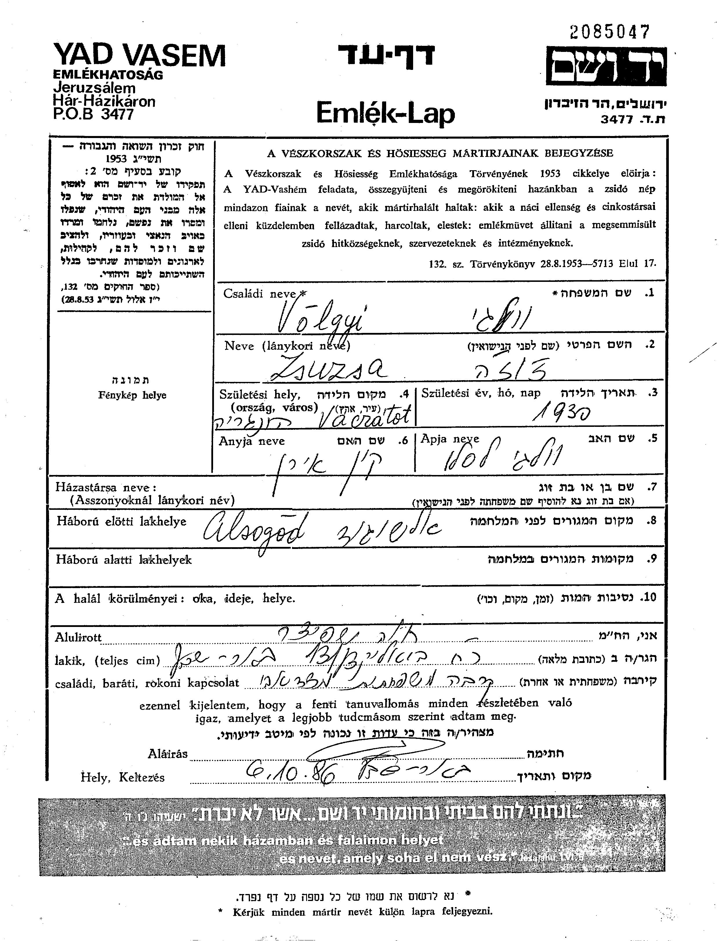 Volgyi Volgil Zsuzsa Alsogod, Hongrie Feuille de témoignage