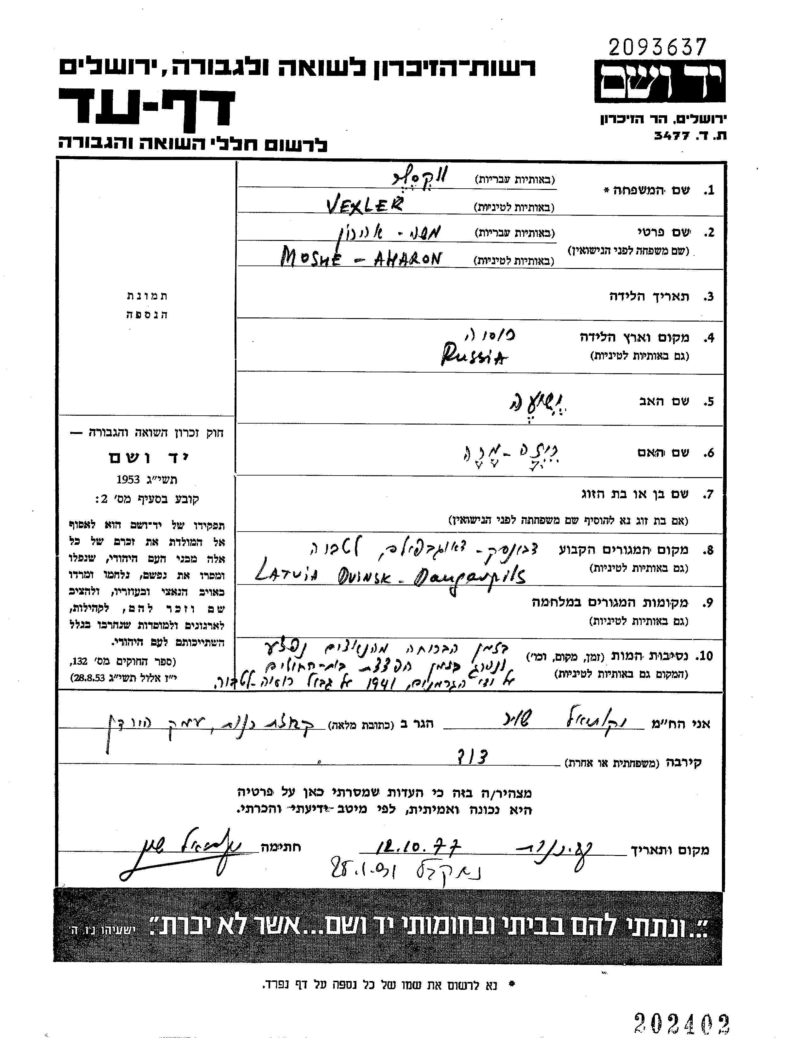 Vexler Moshe Aharon Dvinsk, Lettonie Feuille de témoignage