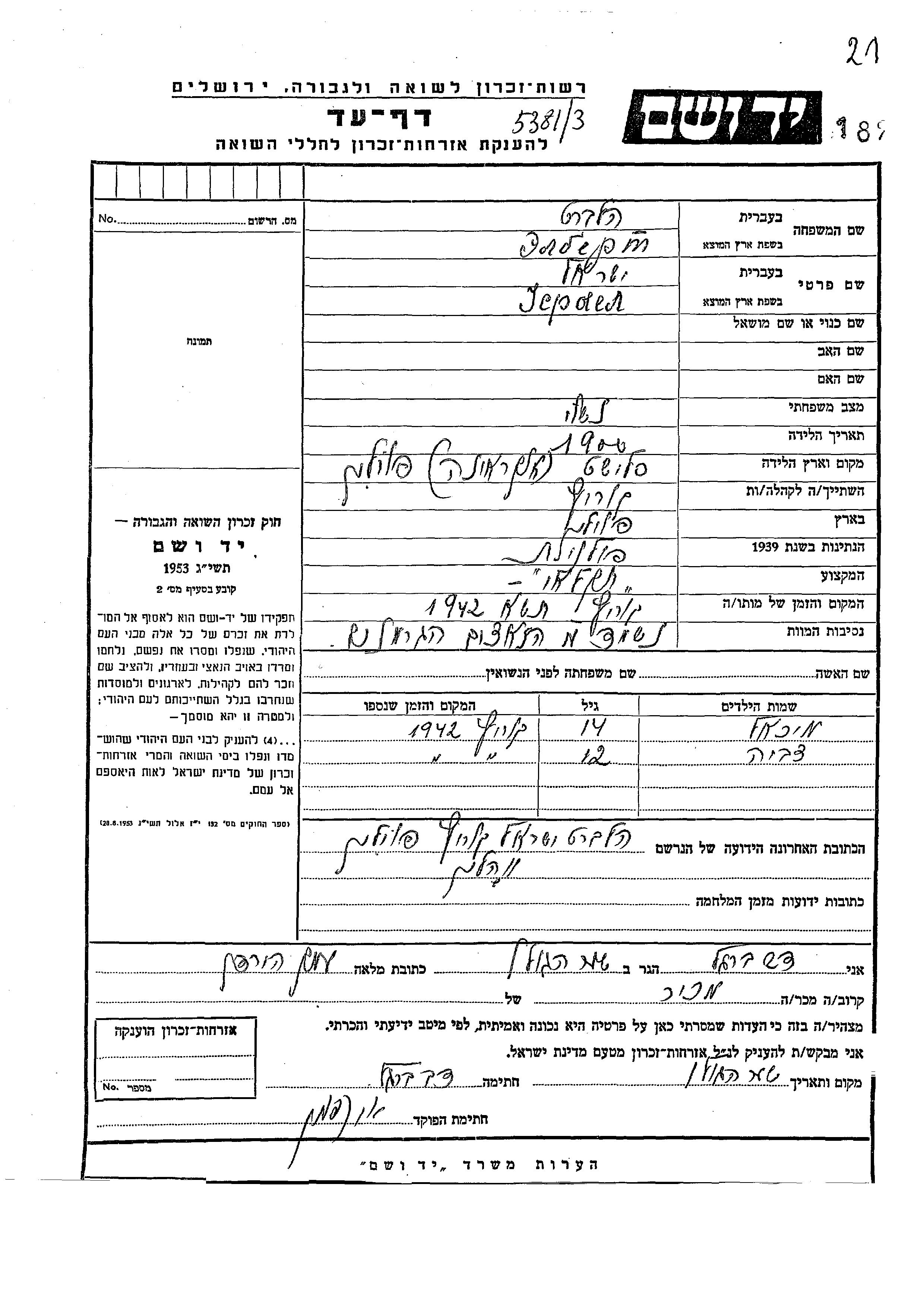 Yisrael a été assassiné pendant la Shoah. Lieu de la mort: Korzec, Pologne en 1942.
