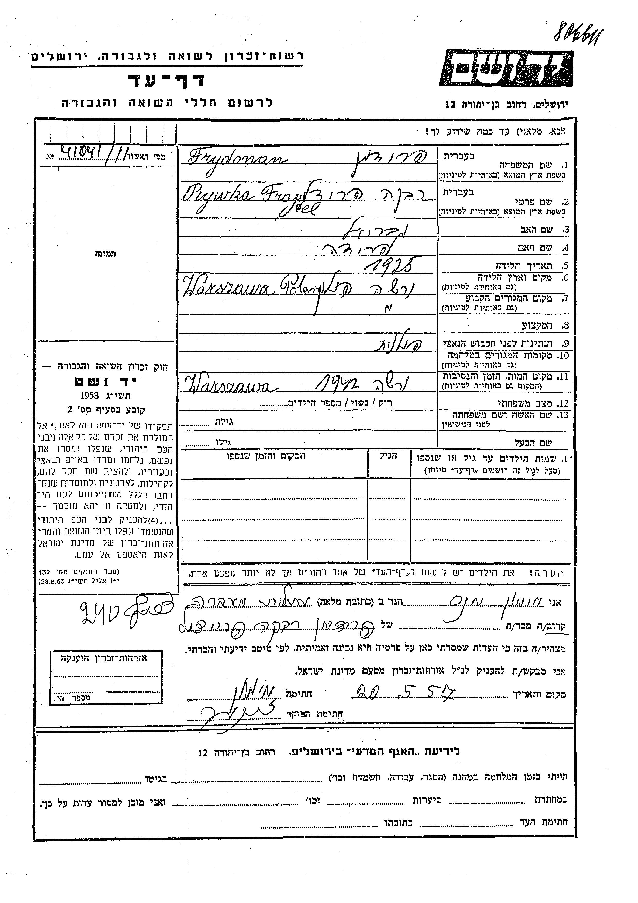 Frydman Rywka Fraydel Fridl 1925 Warszawa, Pologne Feuille de témoignage