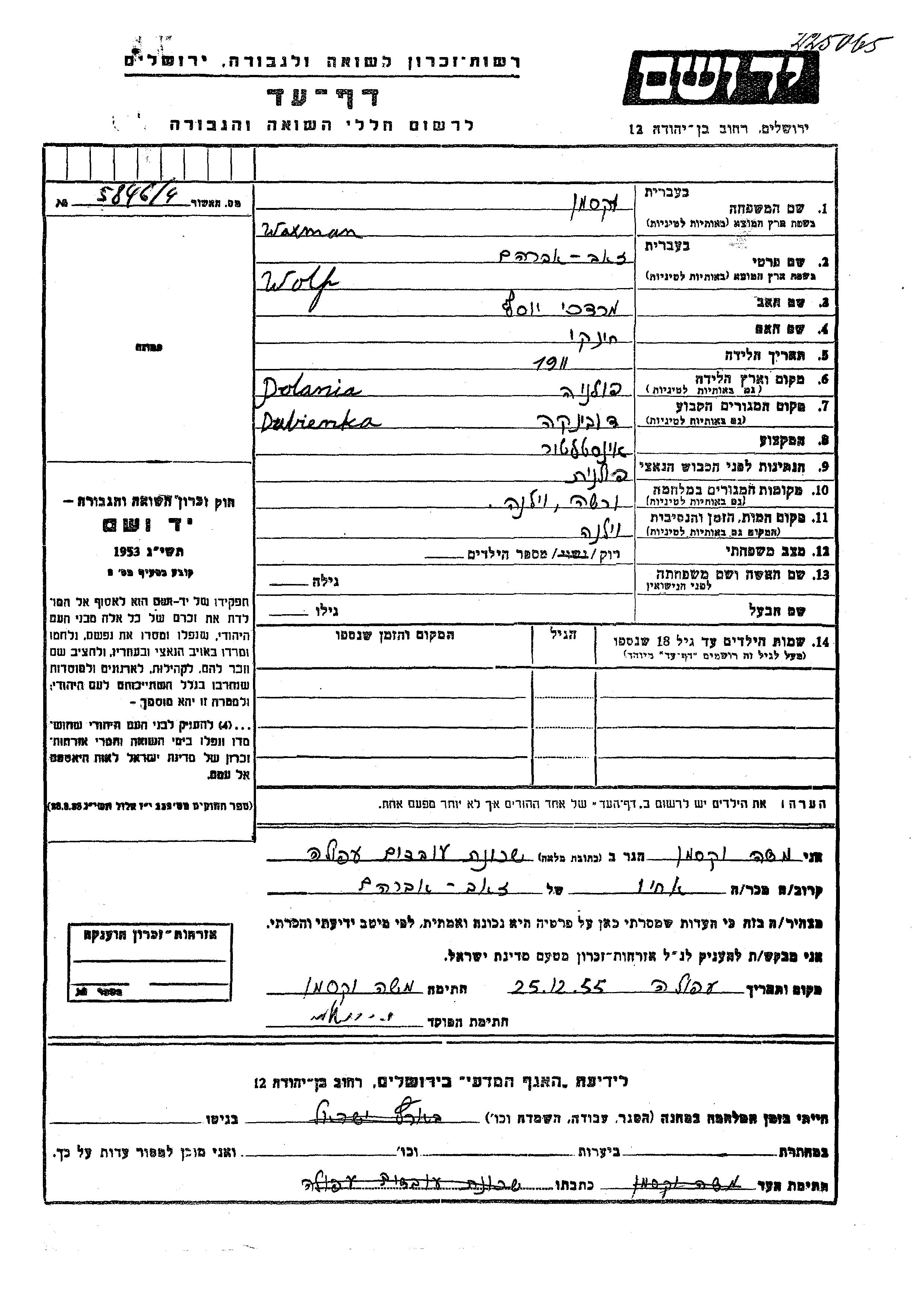 Waxman Wolf Zeev Avraham 1911 Dubienka, Pologne Feuille de témoignage