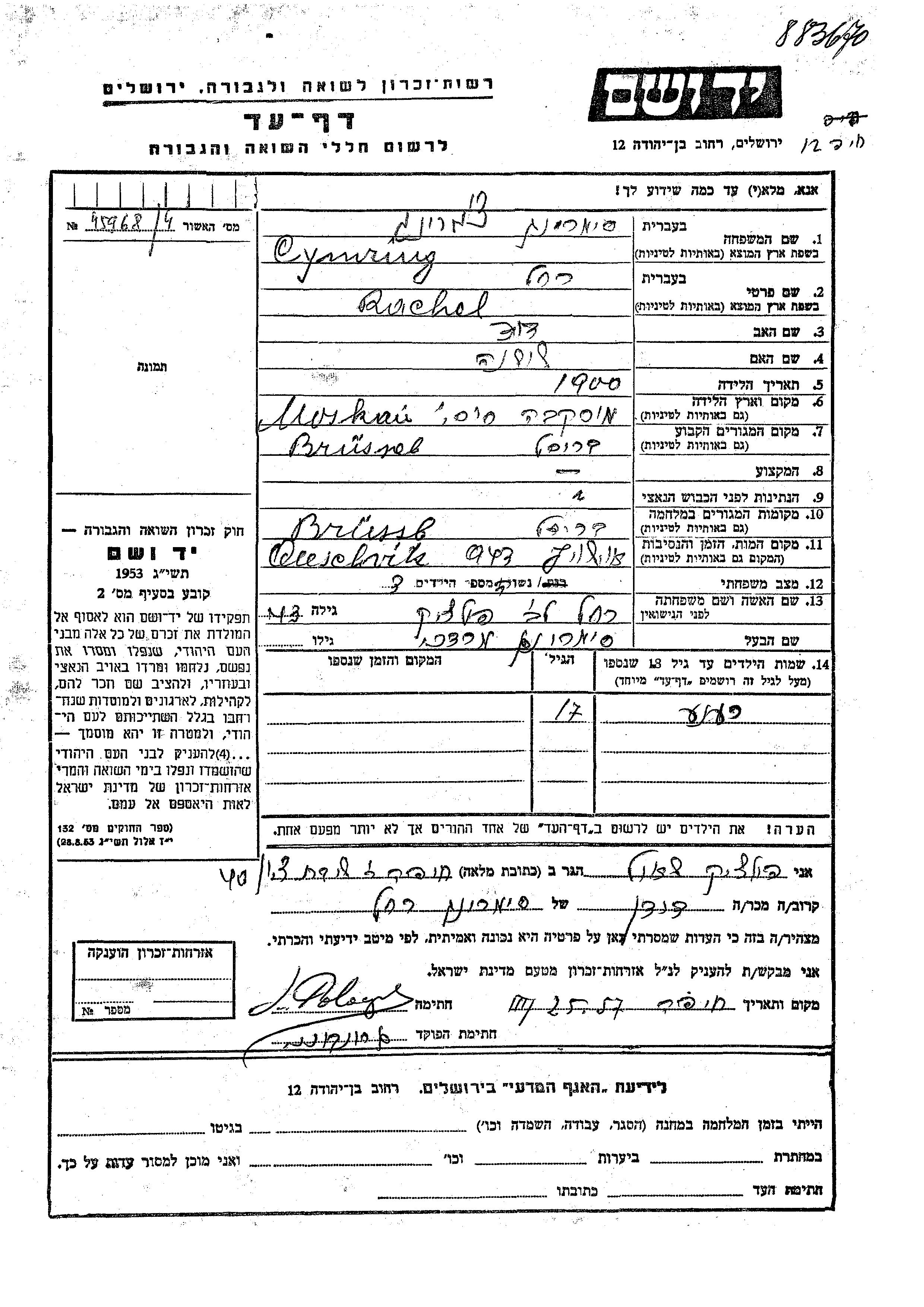 Cymring Rachel 1900 Brussels, Belgique Feuille de témoignage
