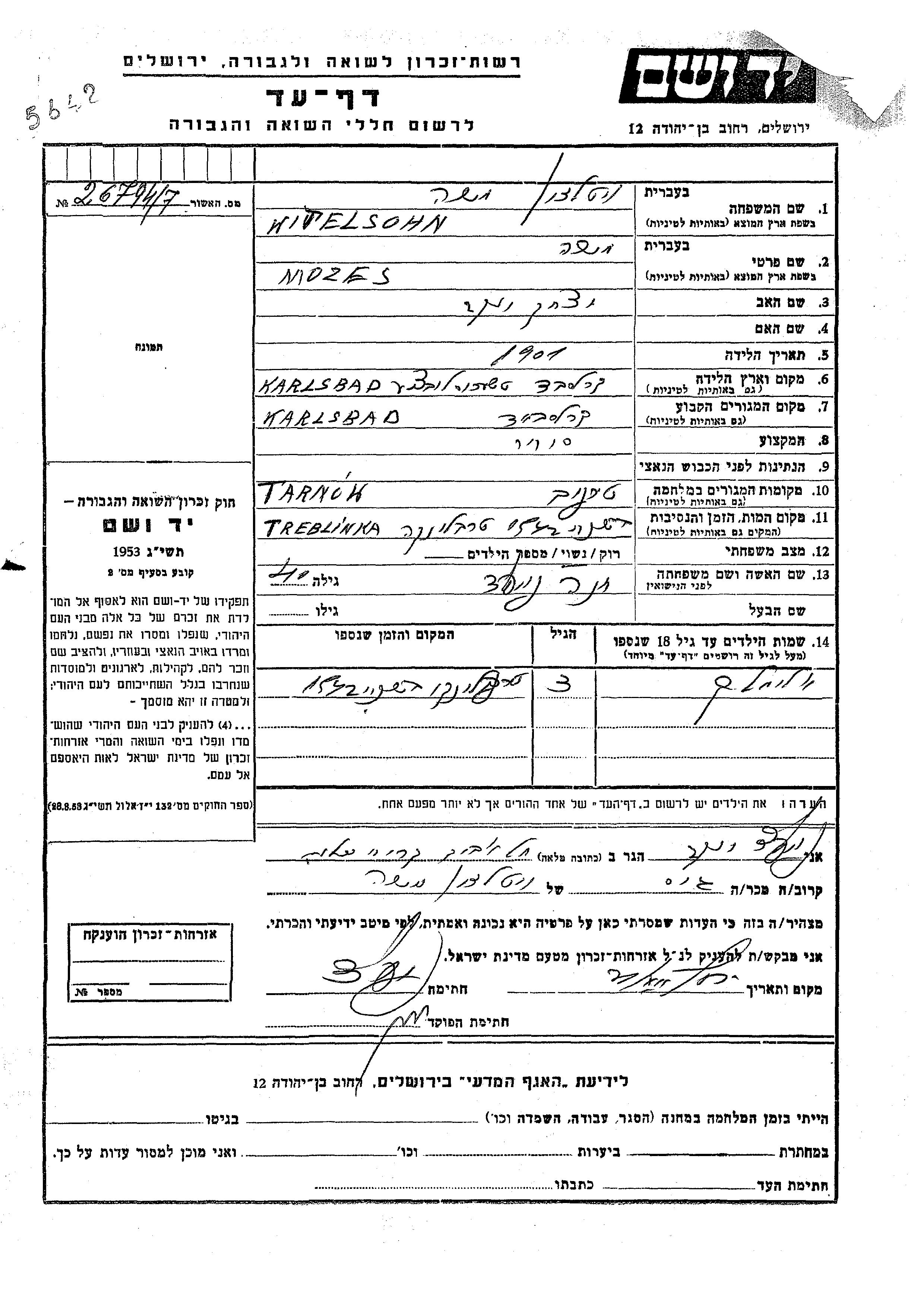 Witelsohn Moshe 1901 Karlsbad, Tchécoslovaquie Feuille de témoignage