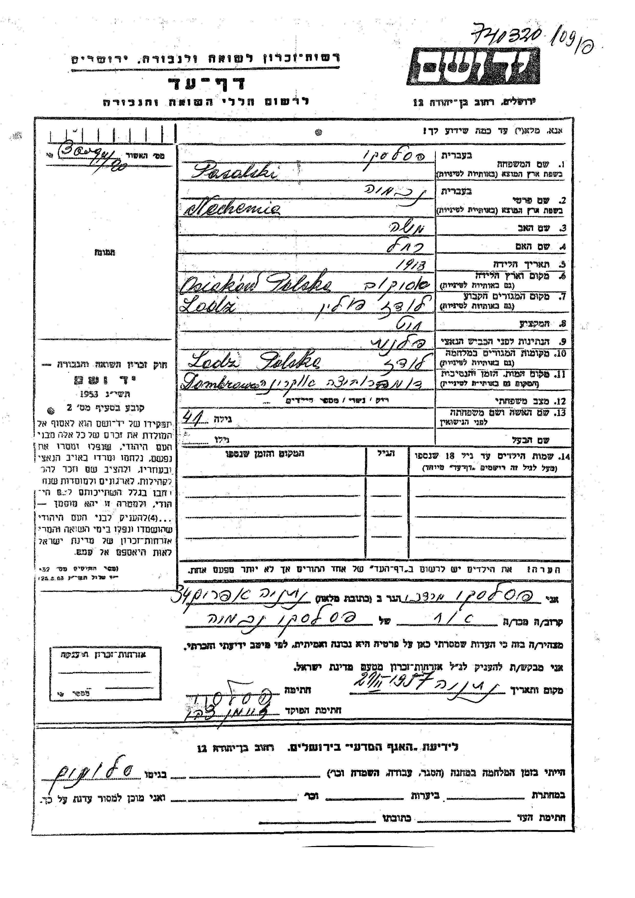 Nechemia Pasalski est né à Osiakow, Pologne en 1913, fils de Moshe et de Rakhel. Il était Tailleur. Avant la seconde guerre mondiale il vivait à Lodz, Pologne. Au cours de la guerre, il était à Lodz, Pologne.