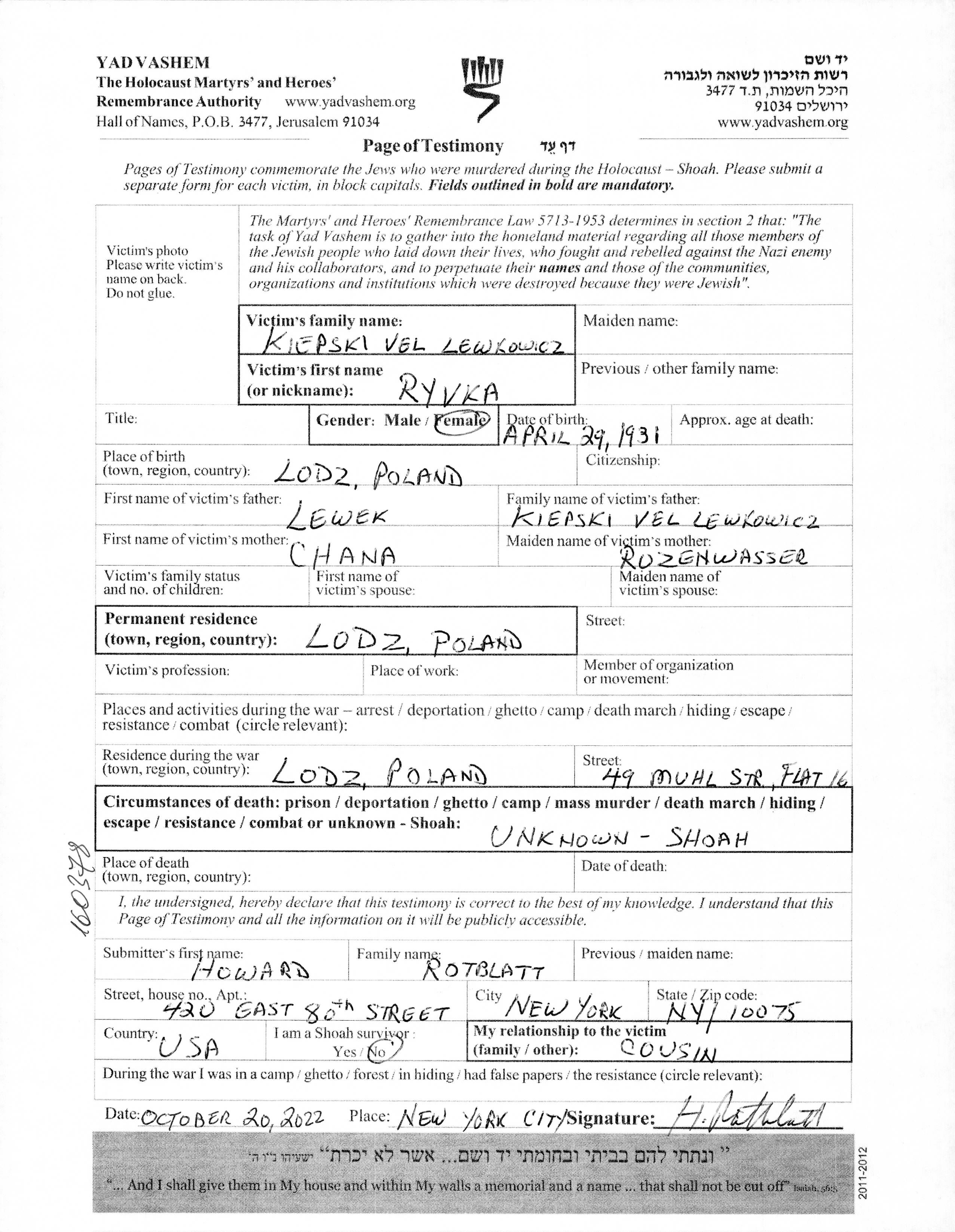 Recherche par lieu de résidence permanente avant la Shoah, ville, village, département, région ou pays.