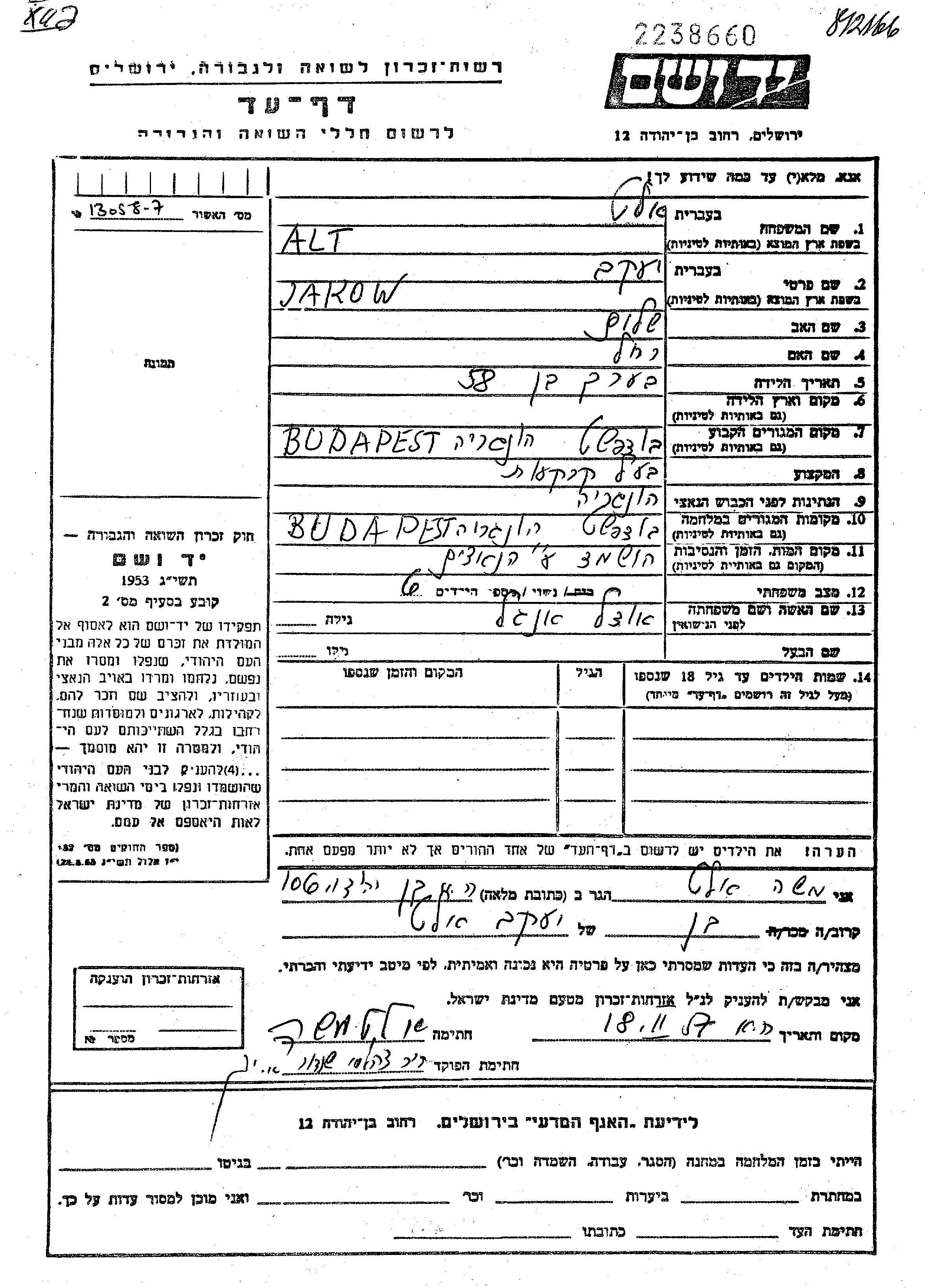 Alt Jakow Budapest, Hongrie Feuille de témoignage