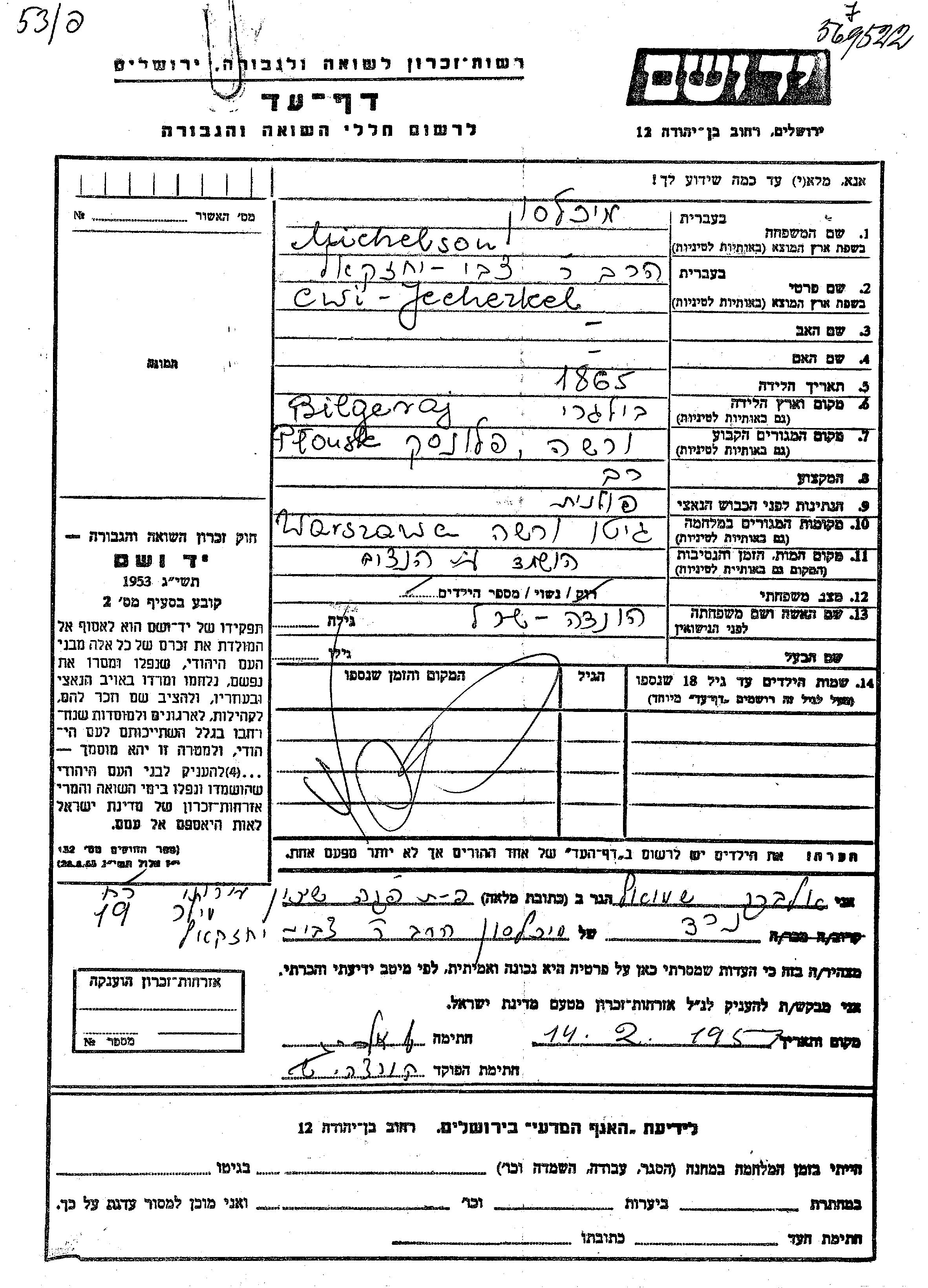| Michelson | Cwi Yechezkel | 1865 | Varsha, Pologne | Feuille de témoignage |