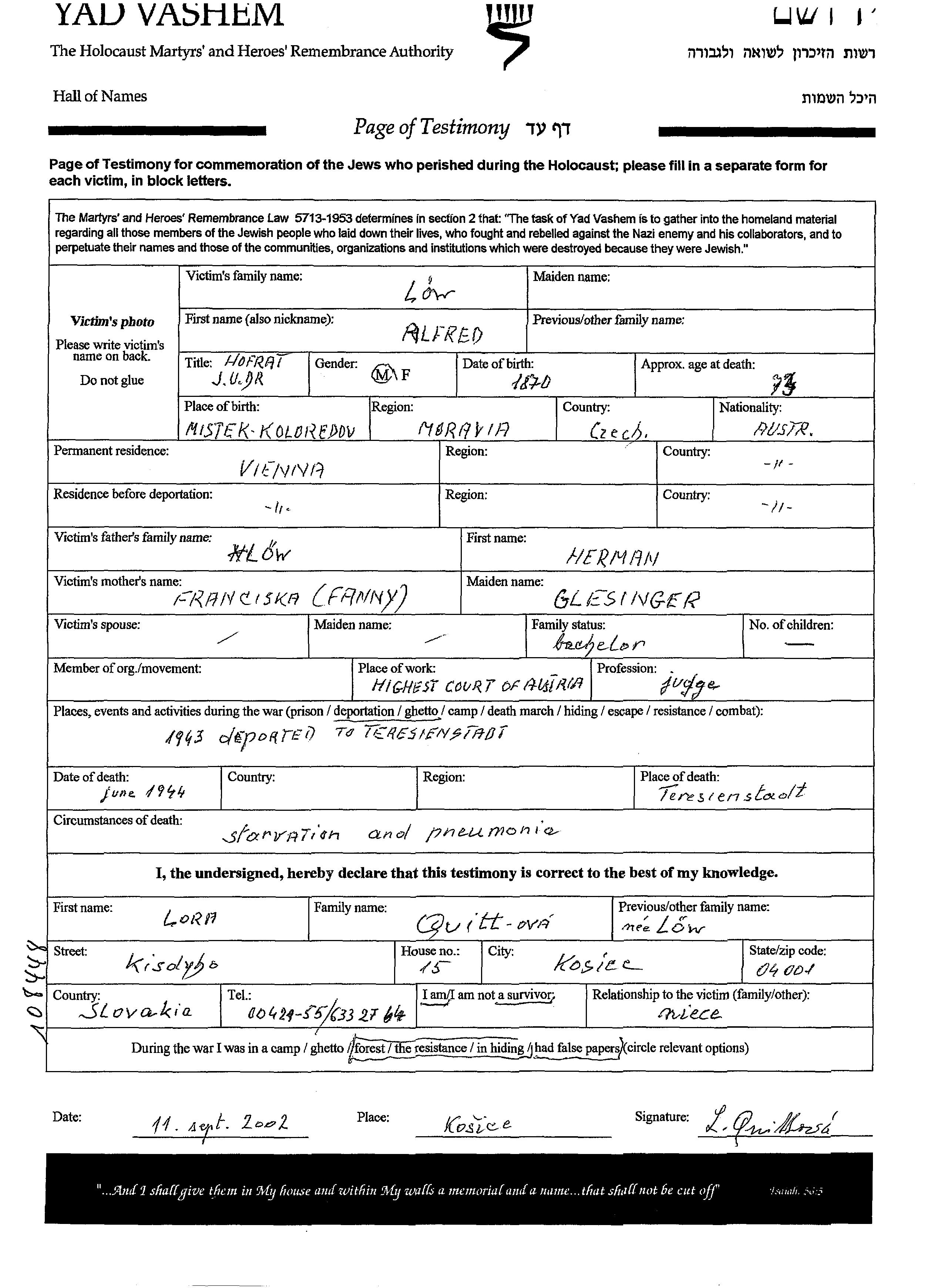 Alfred a été assassiné pendant la Shoah. Lieu de la mort: Theresienstadt, Tchécoslovaquie.