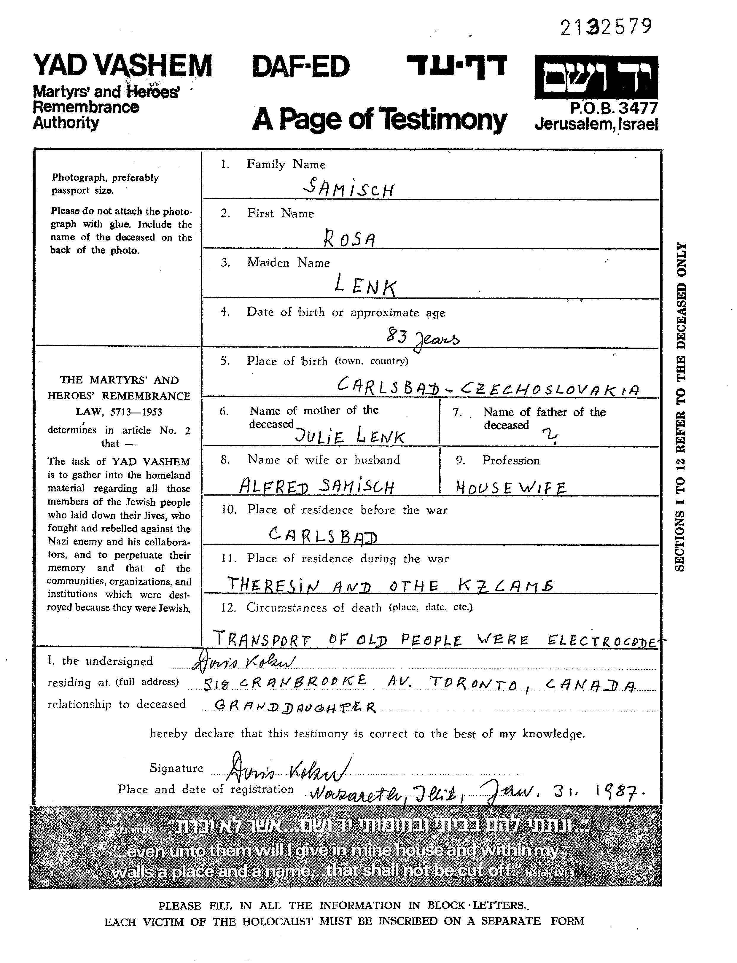 | Samisch | Rosa | Karlsbad, Tchécoslovaquie | Feuille de témoignage | |