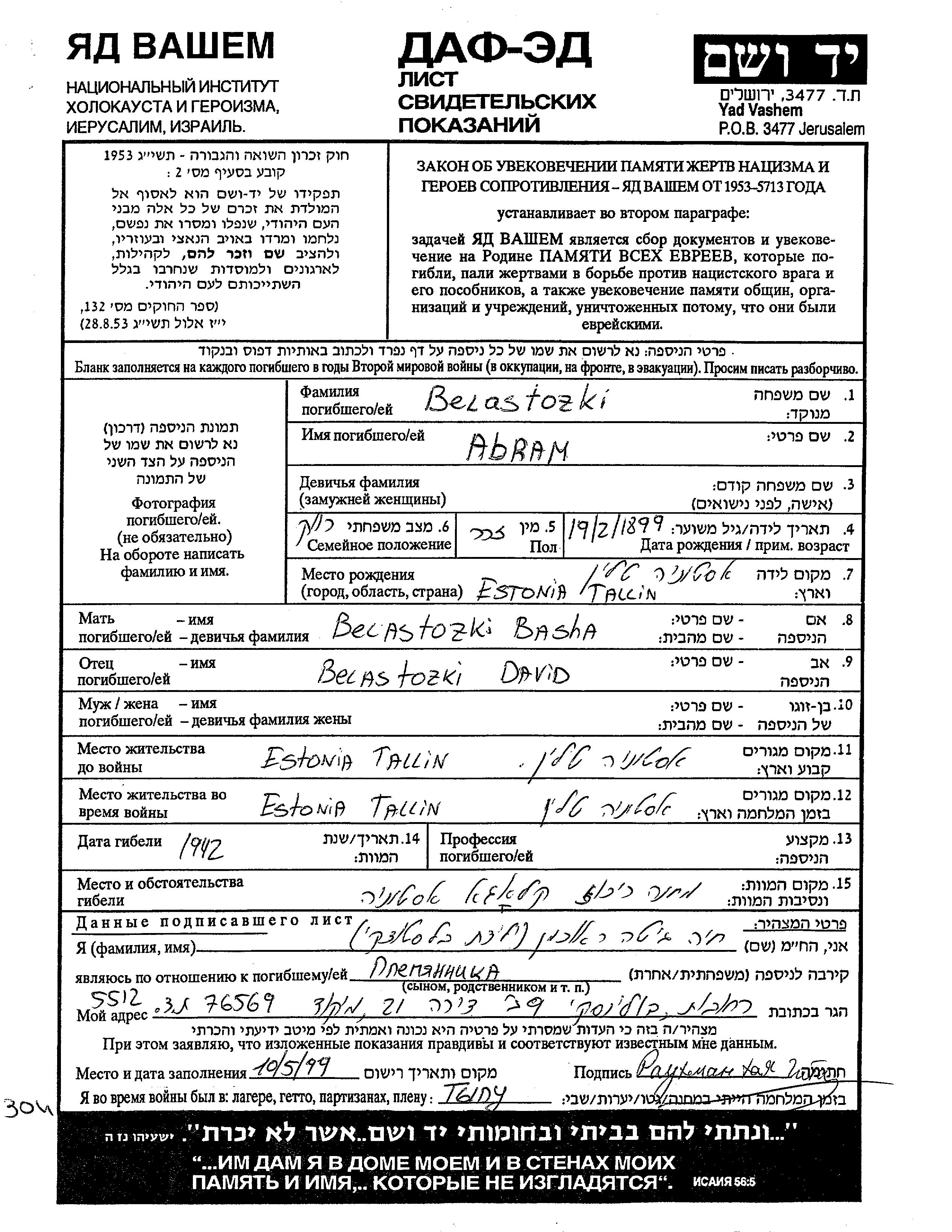 Belastozki Abram 1899 Tallinn, Estonie Feuille de témoignage