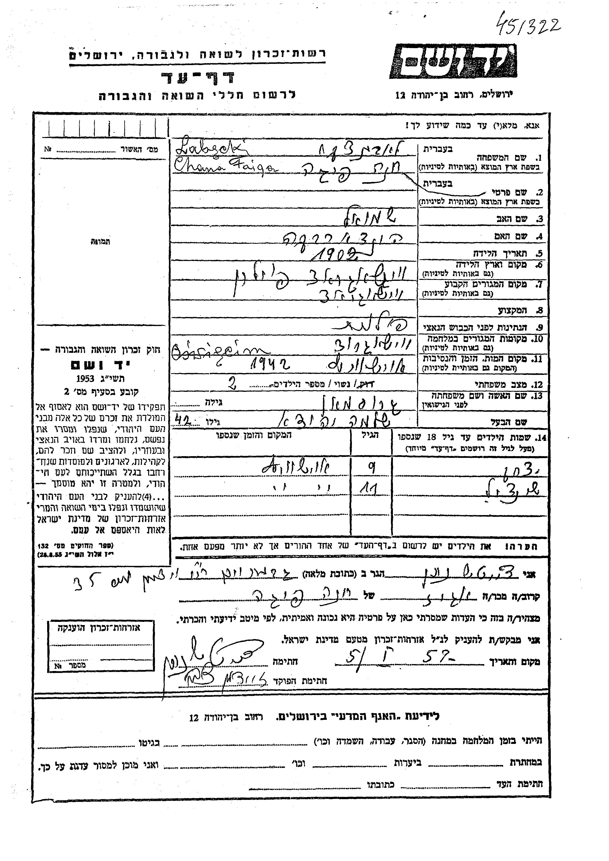 Labecki Lavatzki Chana Faiga 1902 Vishegrod, Pologne Feuille de témoignage