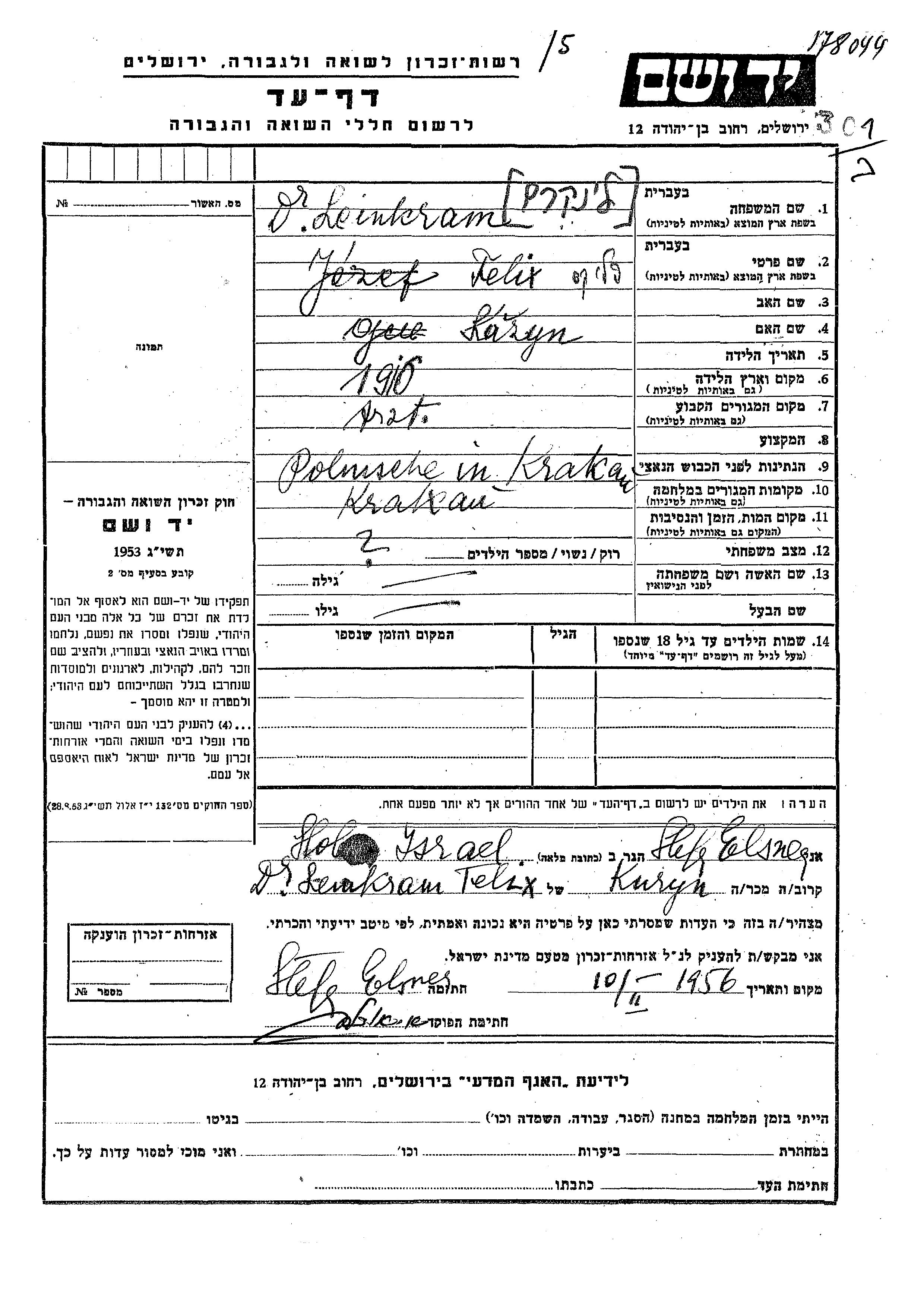 Dr. Felix Leinkram est né à Krakow, Pologne en 1916, fils de Karyn. Il était Médecin. Au cours de la guerre, il était à Krakow, Pologne.