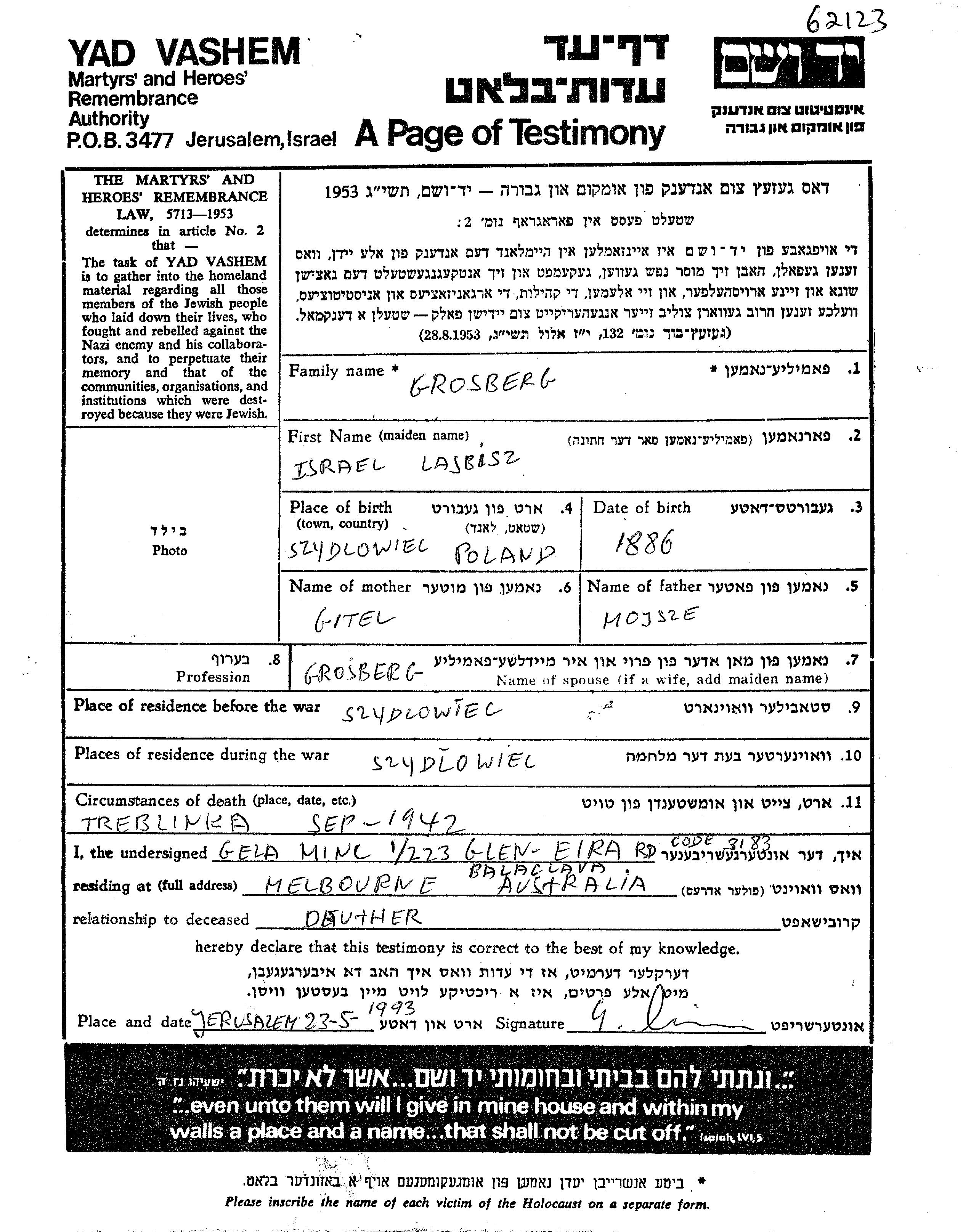 Grosberg Israel Lajbisz 1886 Szydlowiec, Pologne Feuille de témoignage
