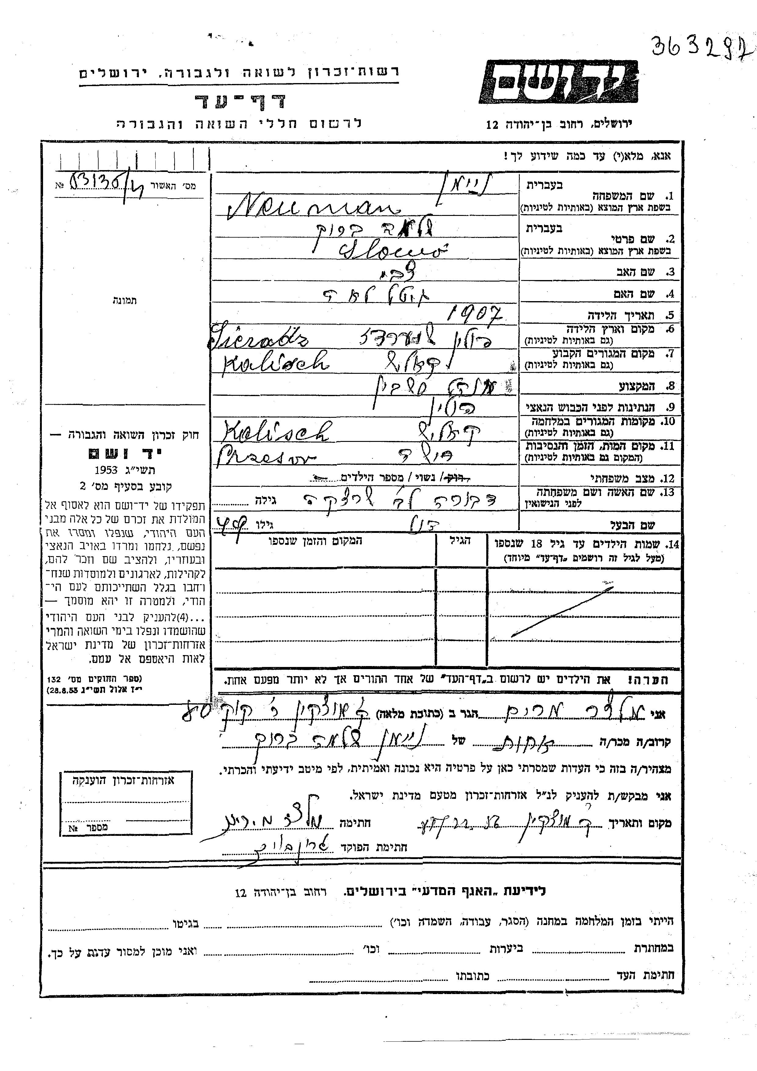 Neuman Slomo Barukh 1907 Kalisz, Pologne Feuille de témoignage