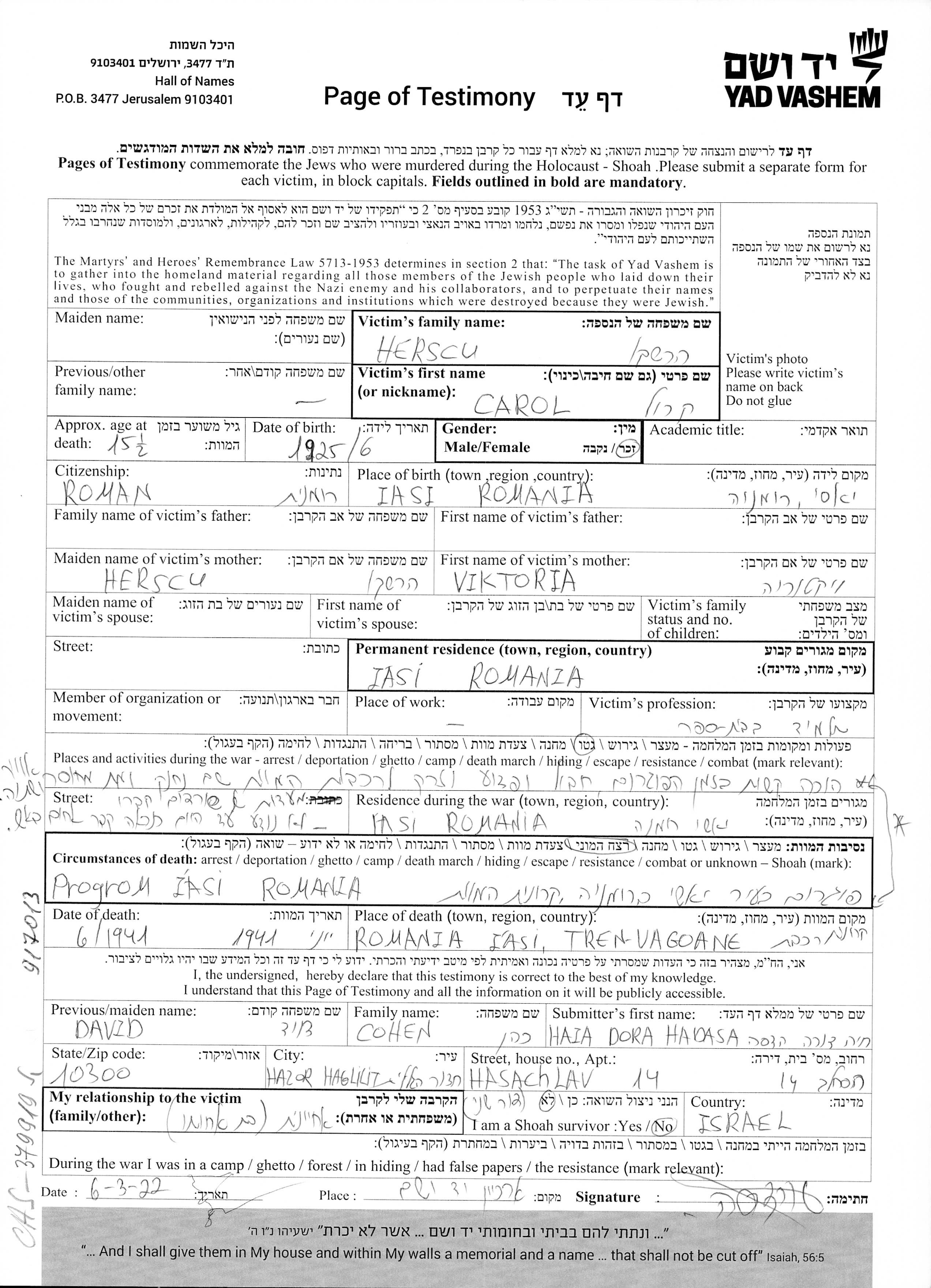 Herscu Carol 1925 Iasi, Roumanie Feuille de témoignage