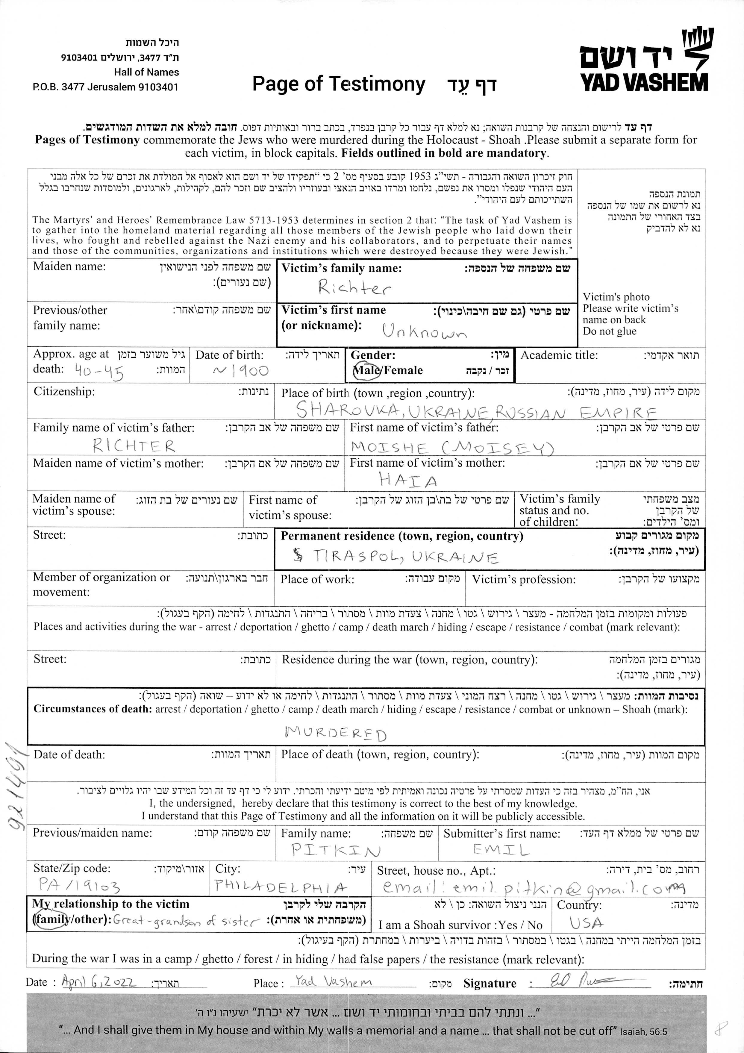 prénom inconnu Richter est né à Sharovka, Ukraine (URSS) en 1900. Avant la seconde guerre mondiale il vivait à Tiraspol, Ukraine (URSS).