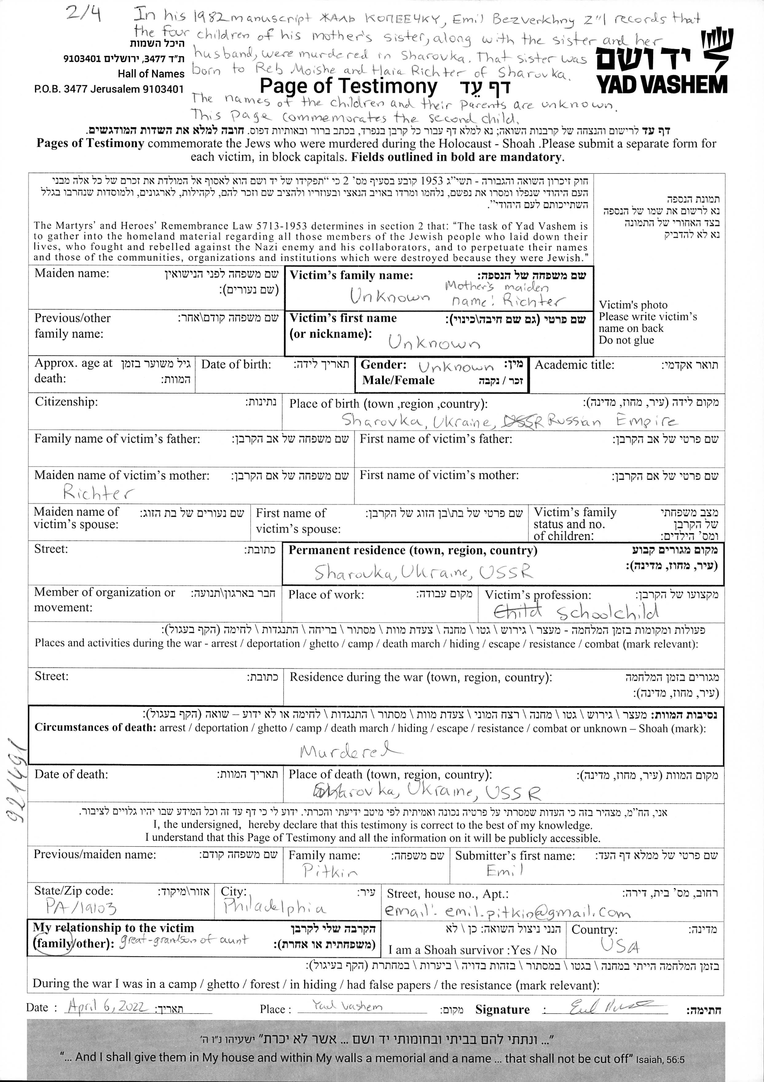 Yad Vashem - Pages of Testimony Names Memorial Collection