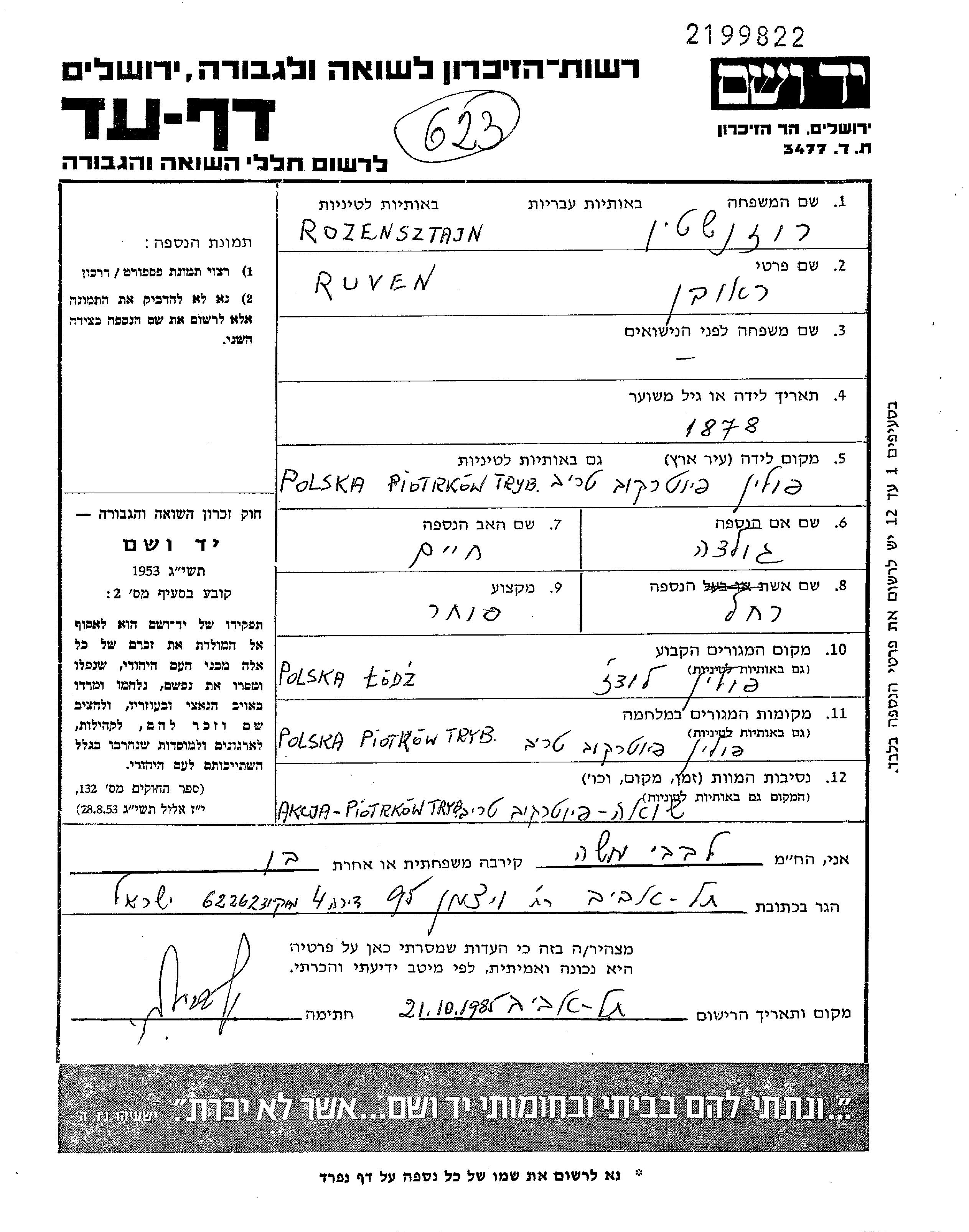 Ruven a été assassiné pendant la Shoah. Lieu de la mort: Piotrkow Trybunalski, Pologne.