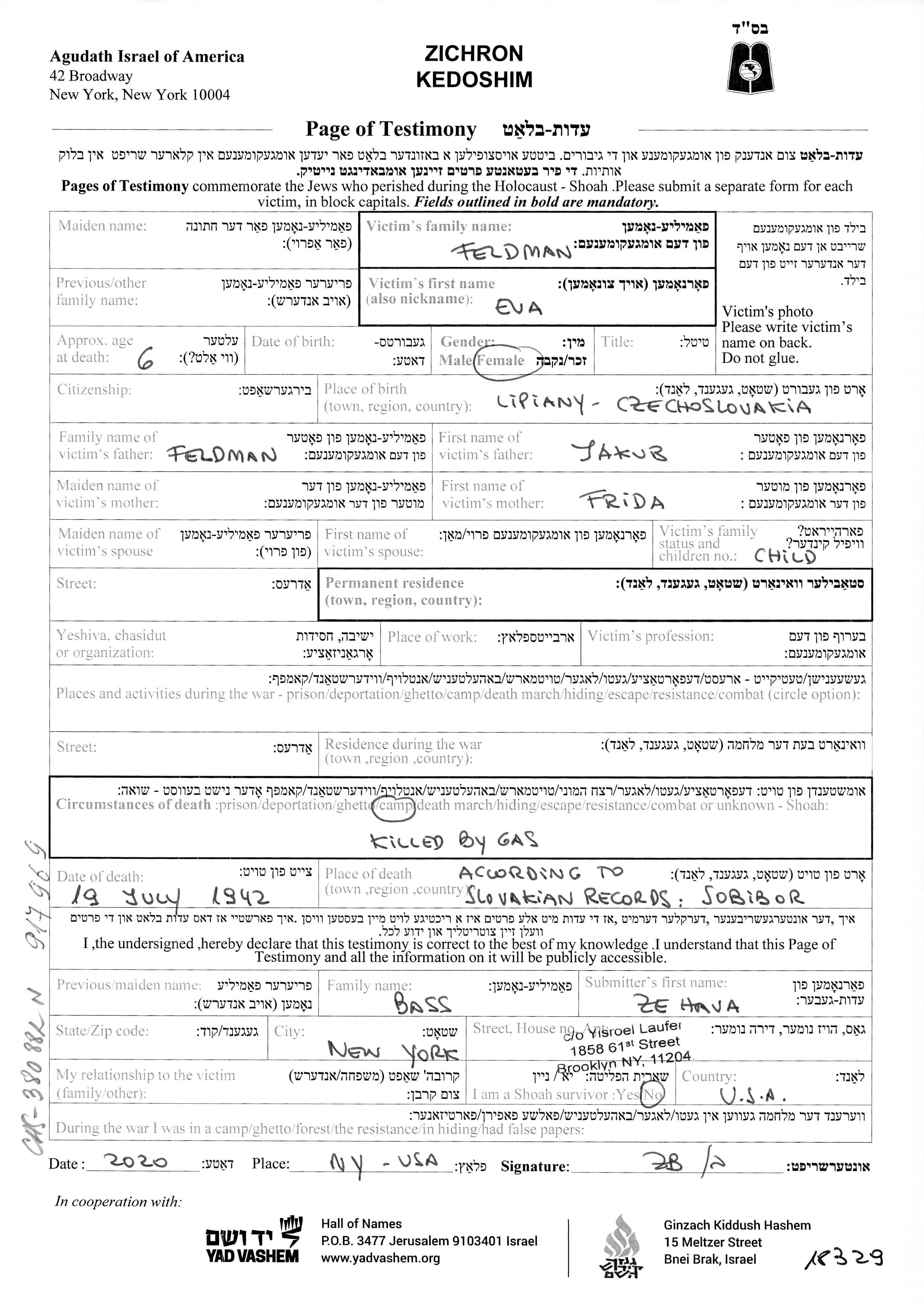 Feldman | Eva | endroit inconnu, | Feuille de témoignage | |