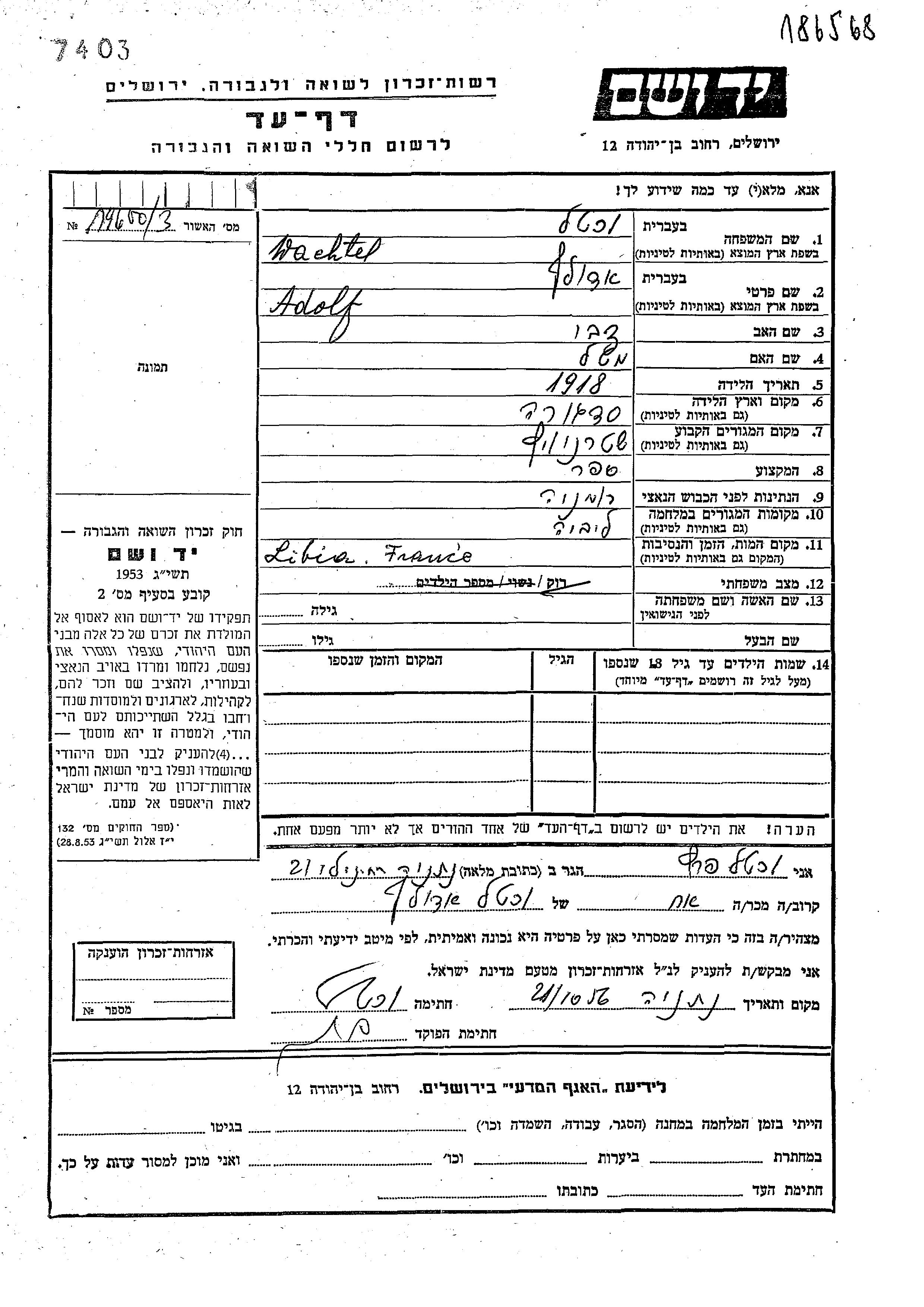 Wachtel Adolf 1918 Czernowitz, Roumanie Feuille de témoignage