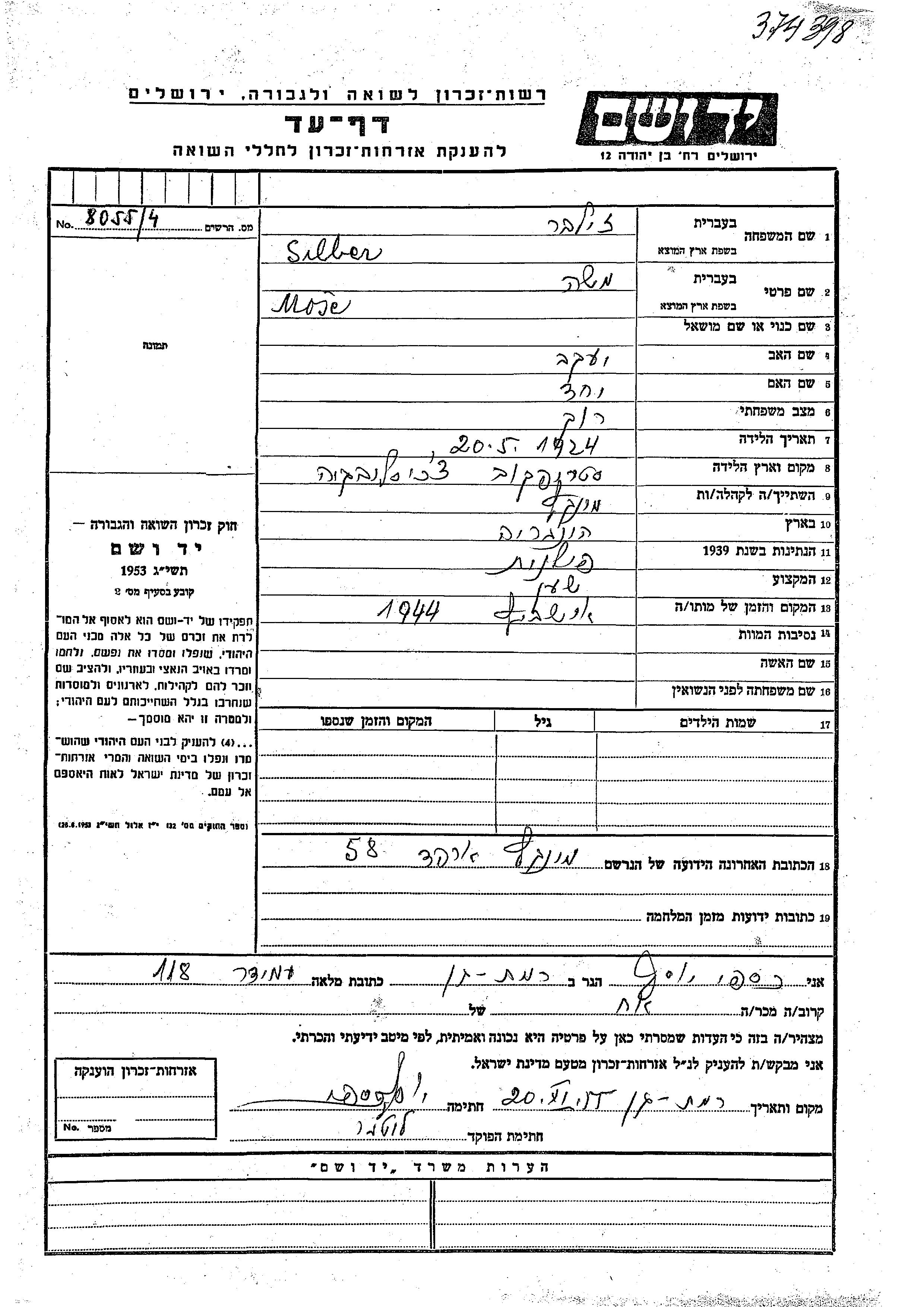 Silber Mose 1924 endroit inconnu, Feuille de témoignage