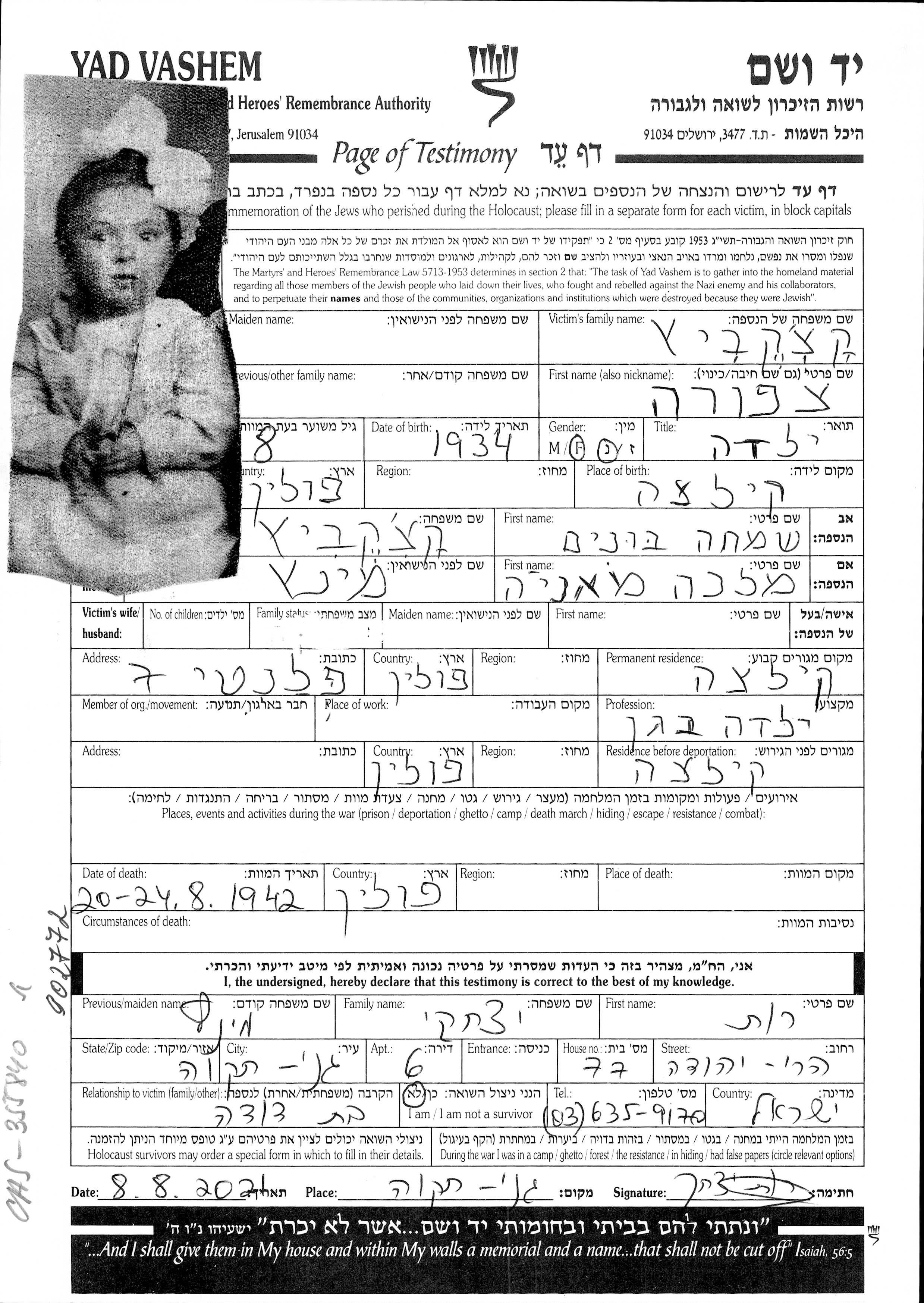 Katzkevitz | Tzipora | 1934 | Kielce, Pologne | Feuille de témoignage |