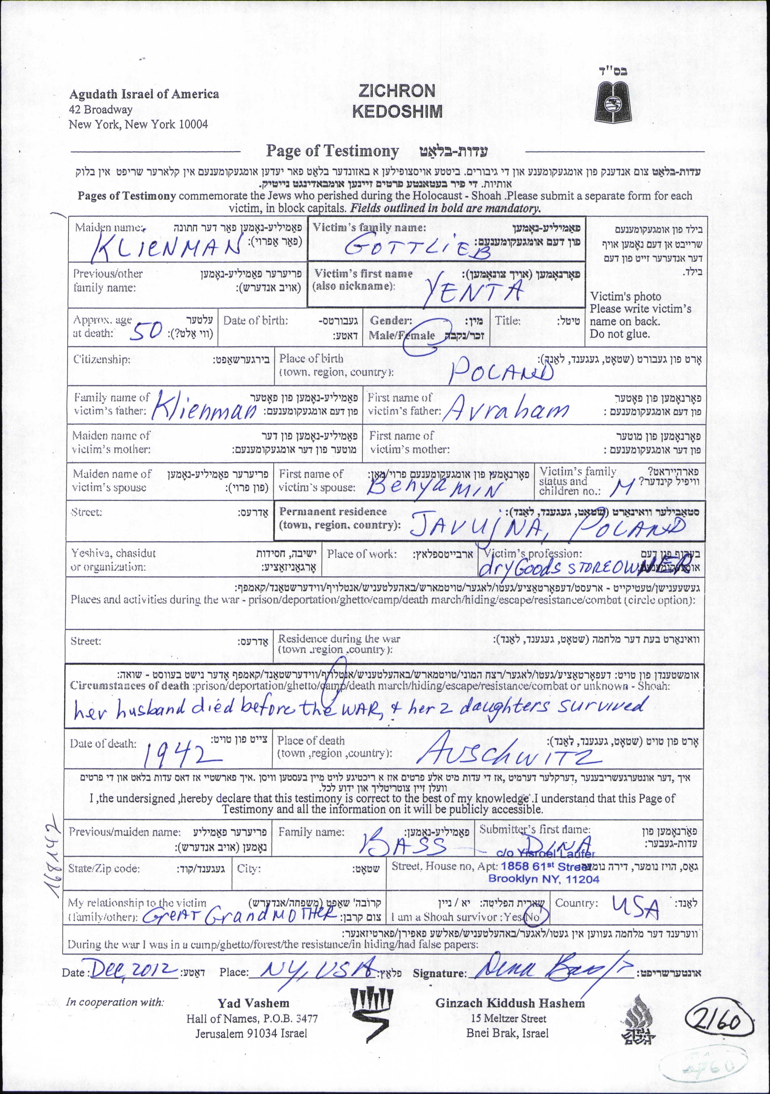 Gottlieb Yenta Jaworzno, Pologne Feuille de témoignage