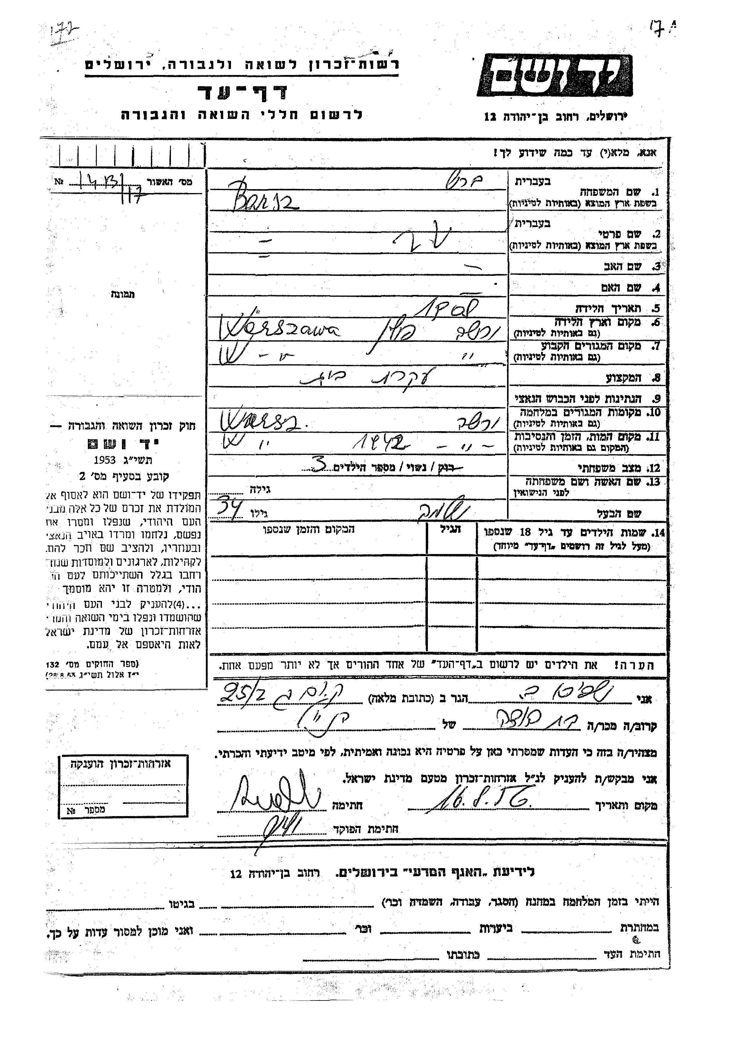 Barasz prénom inconnu 1908 Warszawa, Pologne Feuille de témoignage