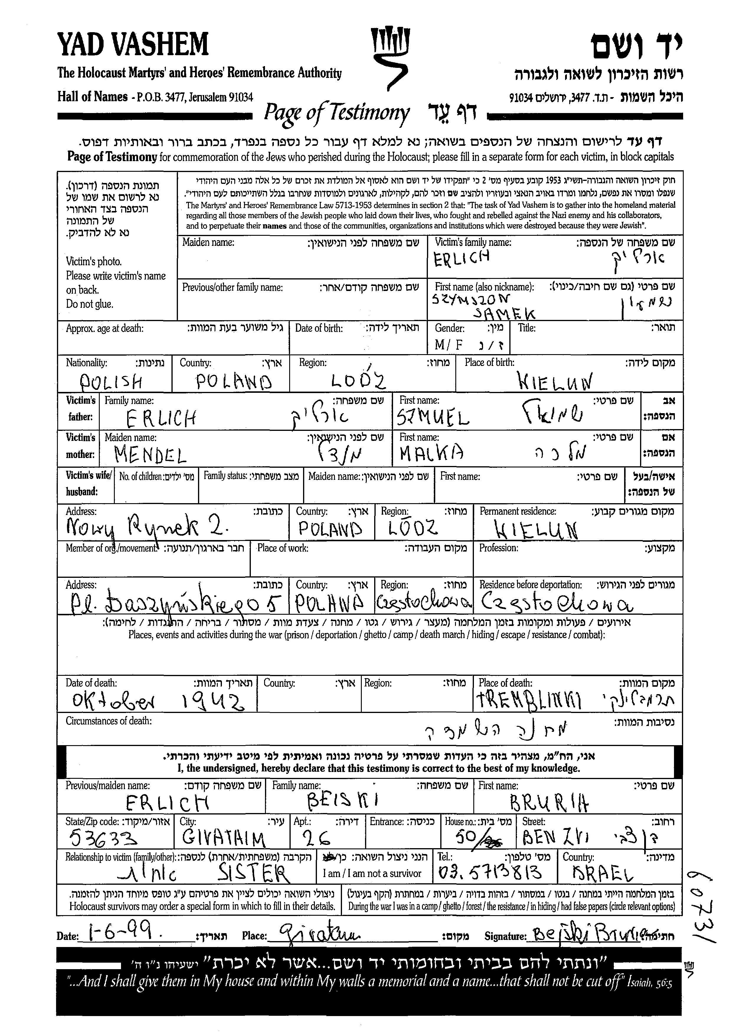 Erlich | Szymszon Shmuel Shimon | Wielun, Pologne | Feuille de témoignage | |