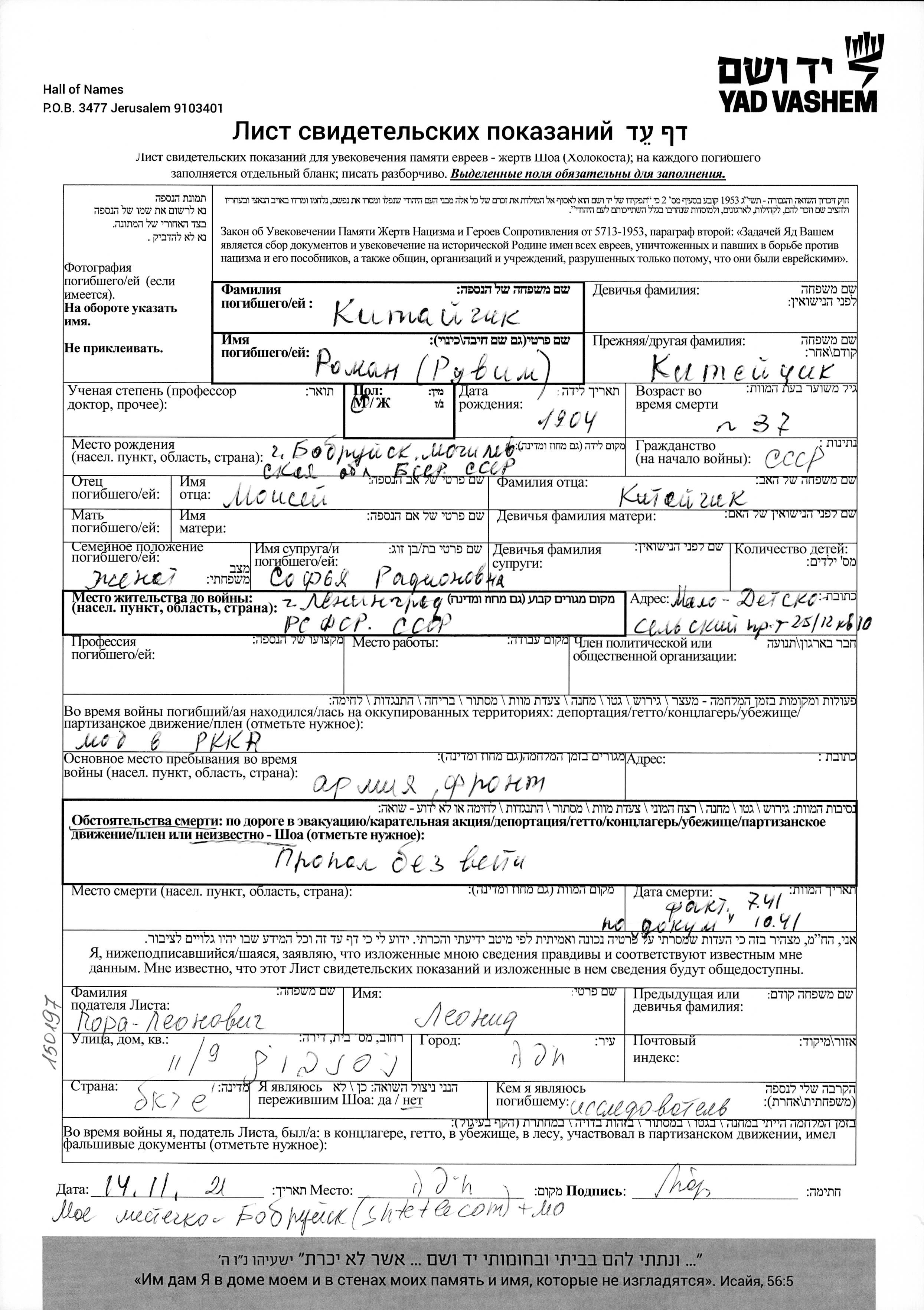 Kitaychik Roman Ruvim 1904 Leningrad, Russie (URSS) Feuille de témoignage