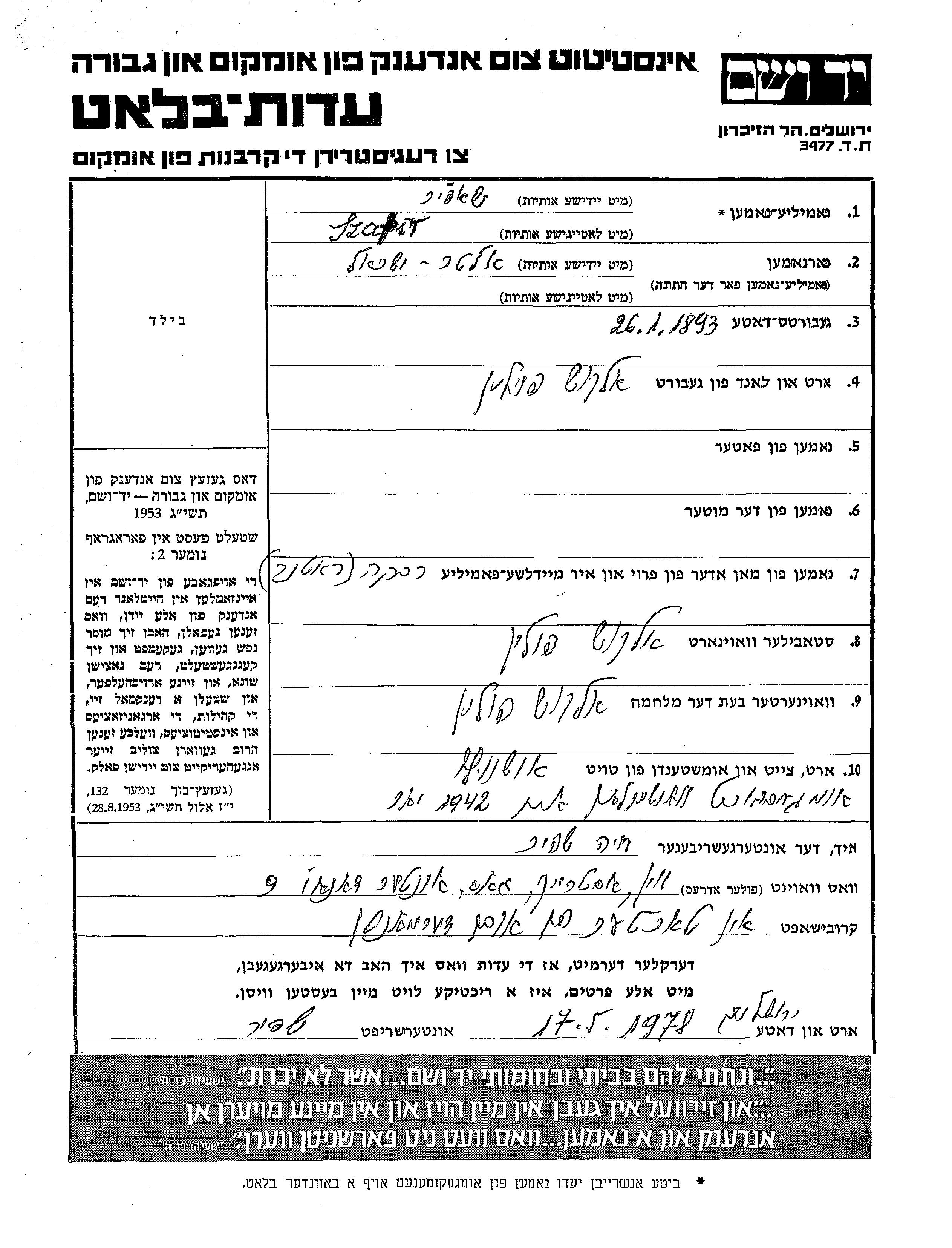 Szapir Alter Yisrael 1893 Olkusz, Pologne Feuille de témoignage