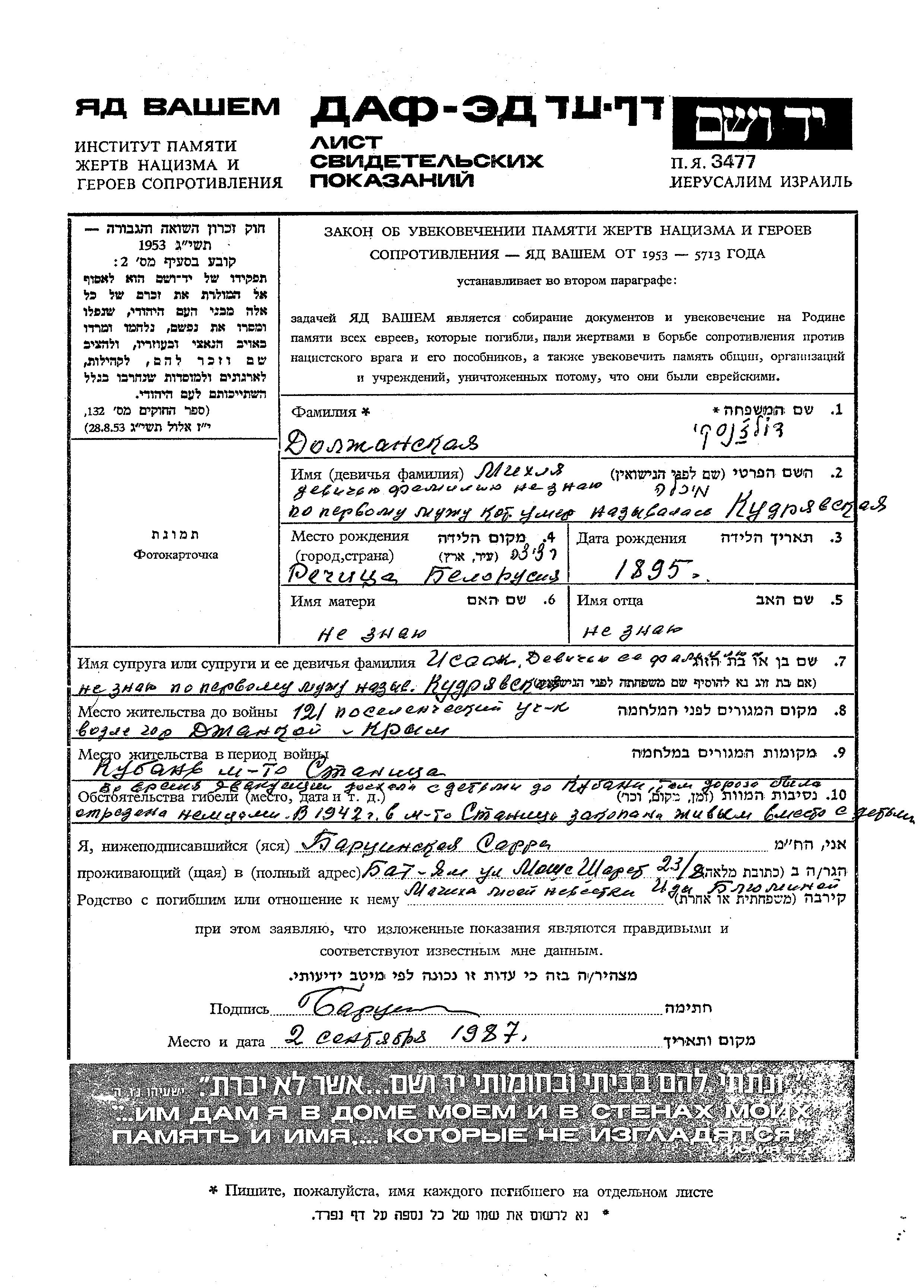 Dolzhanski Michlya 1895 Dzhankoi, Russie (URSS) Feuille de témoignage