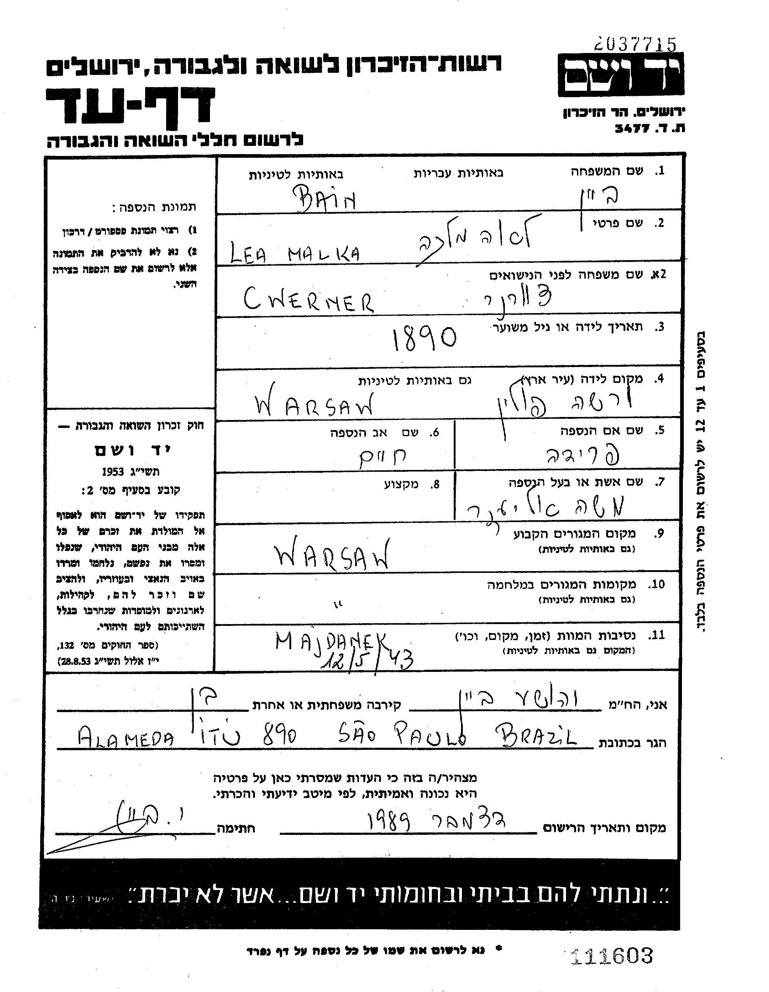 Lea Malka Bain née Cwerner est née à Warszawa, Pologne en 1890. Avant la seconde guerre mondiale elle vivait à Warszawa, Pologne.