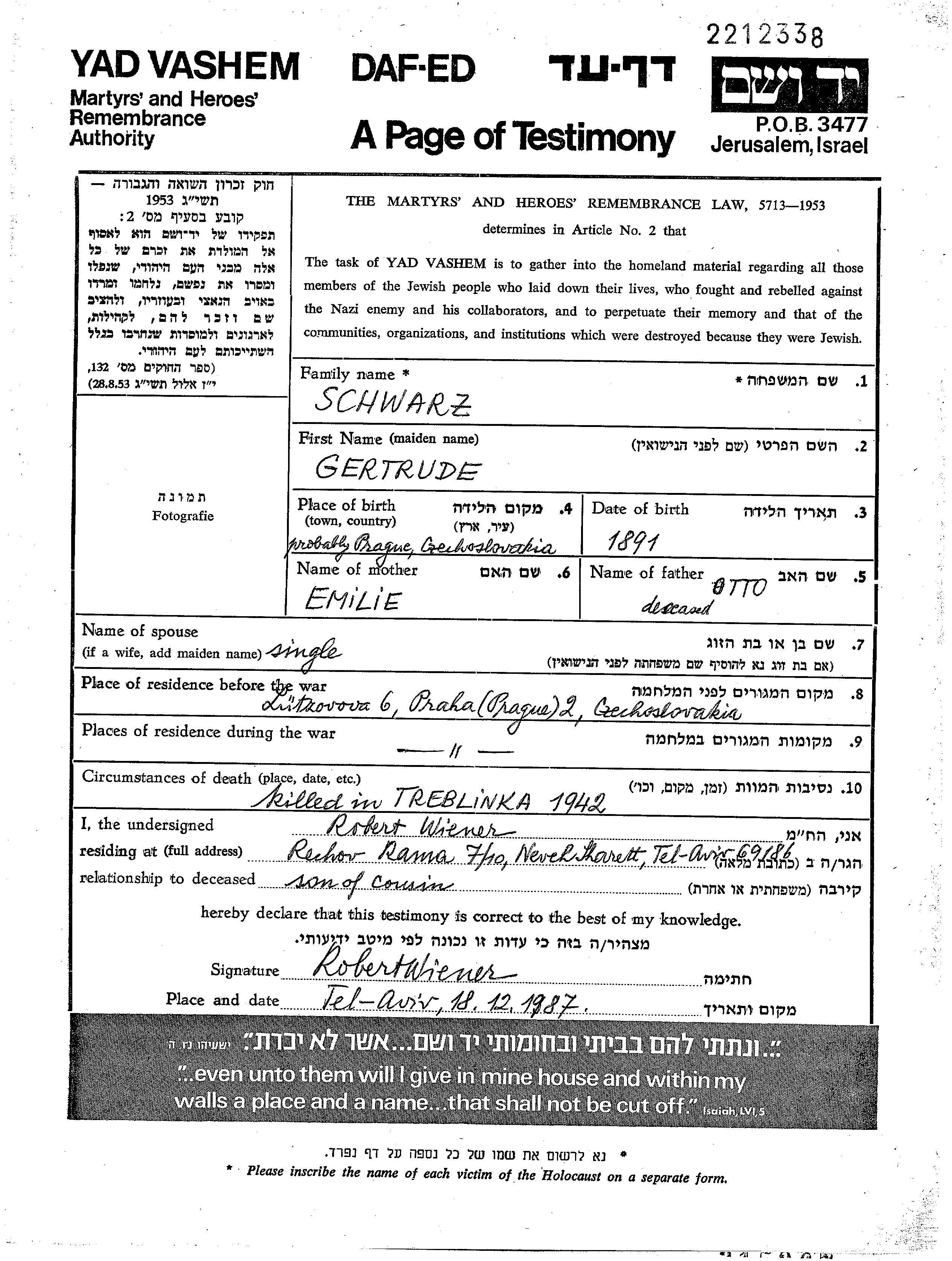 Schwarz Gertrude 1891 Praha, Tchécoslovaquie Feuille de témoignage