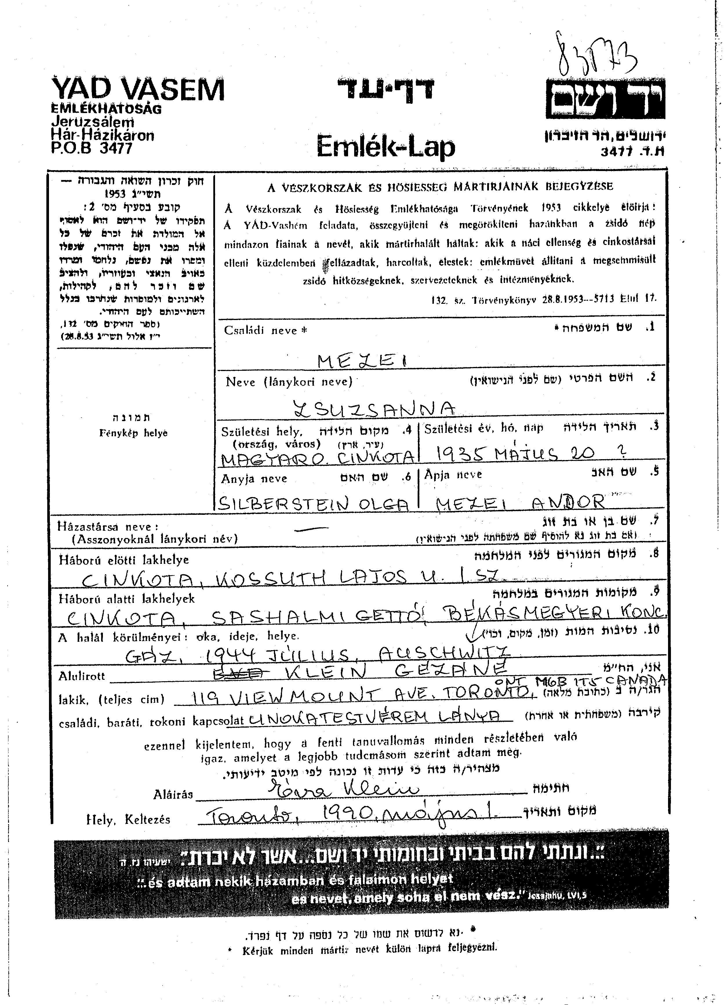 Mezei Zsuzsanna 1935 Cinkota, Hongrie Feuille de témoignage