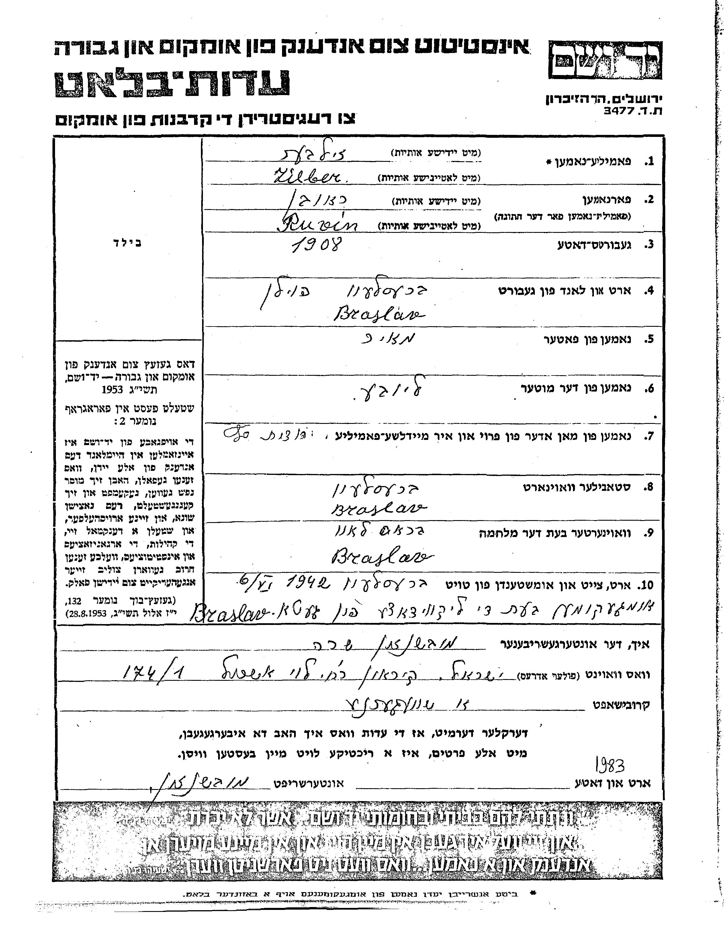 Zilber Reuven 1908 Braslaw, Pologne Feuille de témoignage