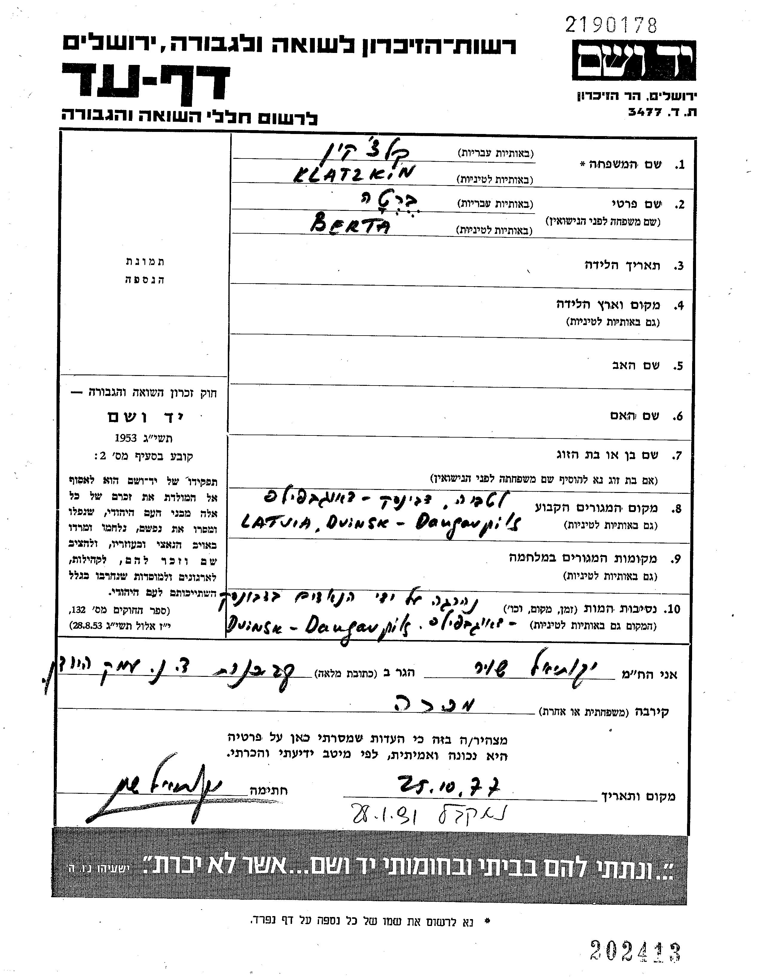 Klatzkin Berta Dvinsk, Lettonie Feuille de témoignage