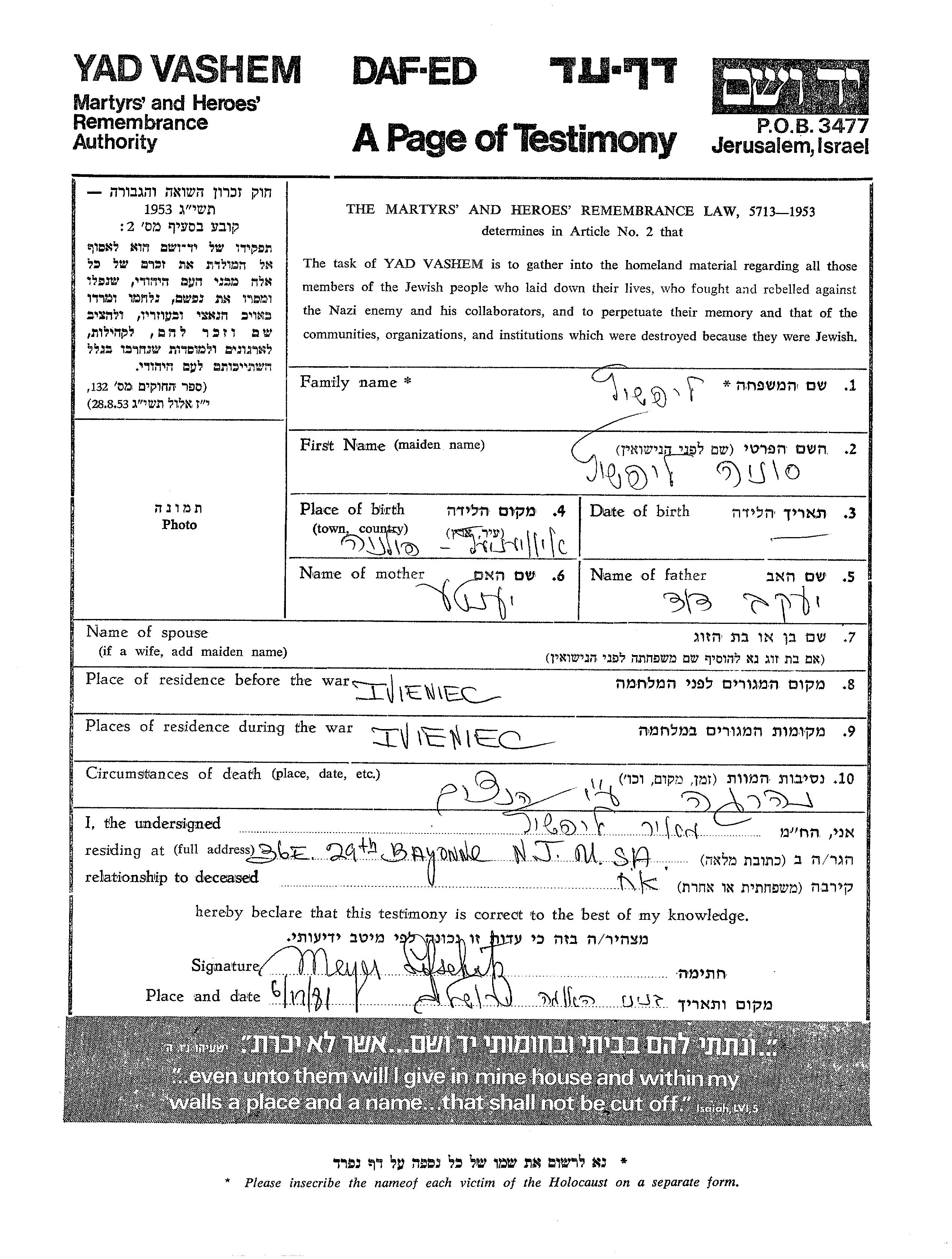 Yad Vashem - Pages of Testimony Names Memorial Collection