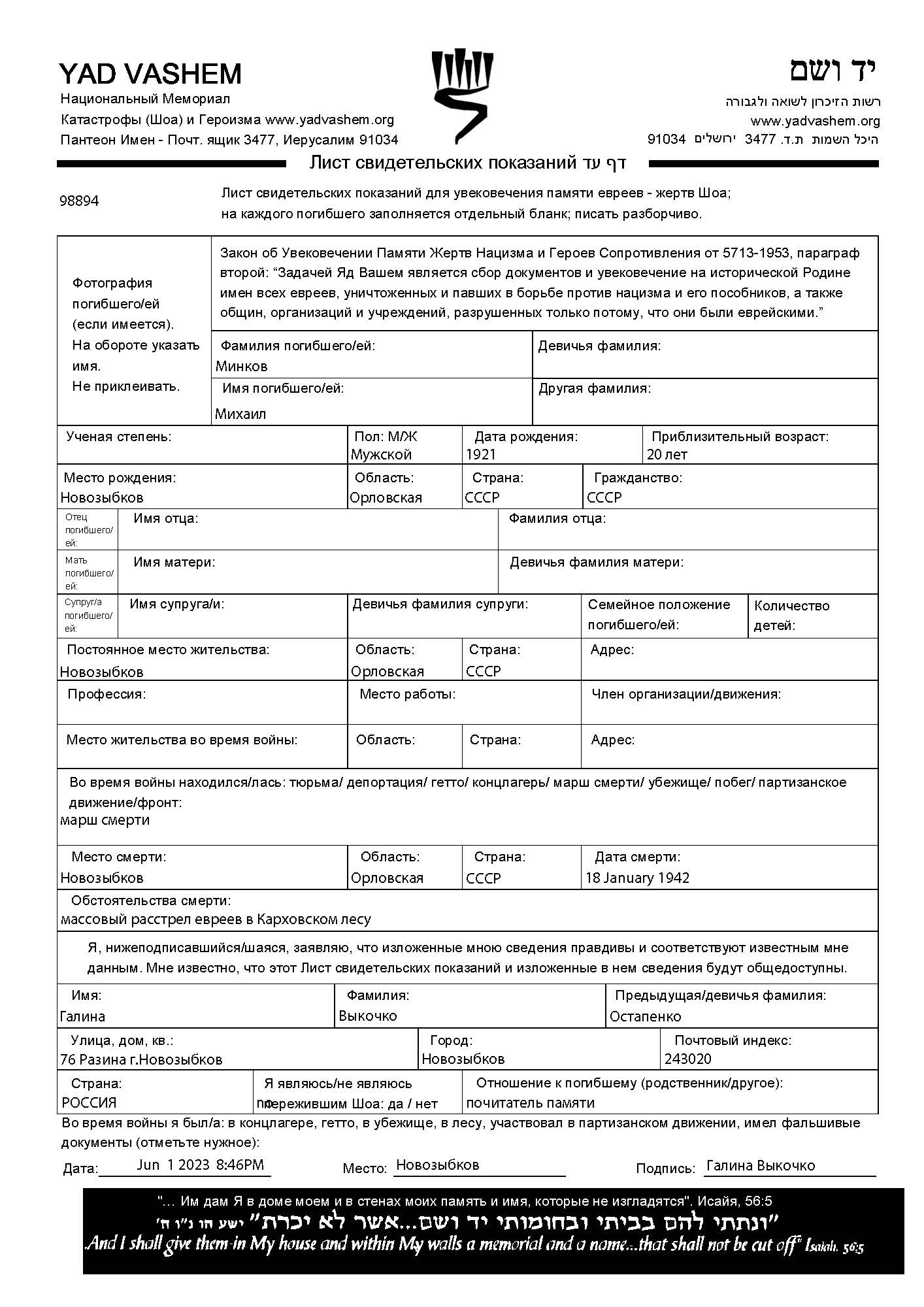 Mikhail Minkov est né à Novozybkov, Russie (URSS) en 1921. Avant la seconde guerre mondiale il vivait à Novozybkov, Russie (URSS). Mikhail a été assassiné pendant la Shoah. Lieu de la mort: Karkhovskiy Forest, Russia (USSR) en 18/01/1942.