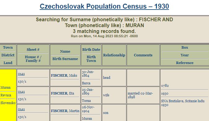 Fischer | Maks | 1864 | Muran, Tchécoslovaquie | Liste de recensement |