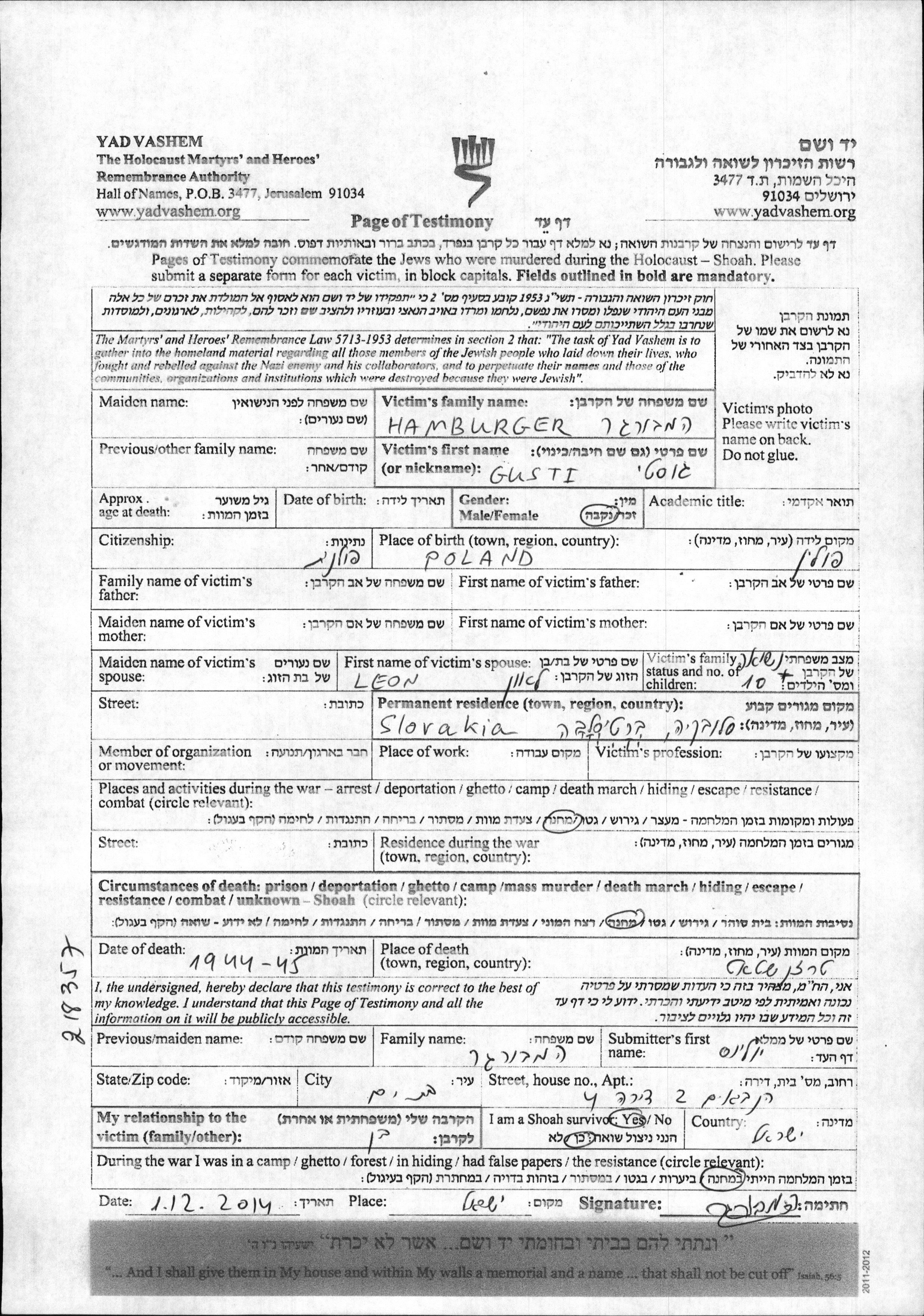 Gusti Gusta Berta Hamburger née Fogel est née à Lwow, Pologne en 1898. Elle était Femme au foyer. Avant la seconde guerre mondiale elle vivait à Slovakia, Tchécoslovaquie.