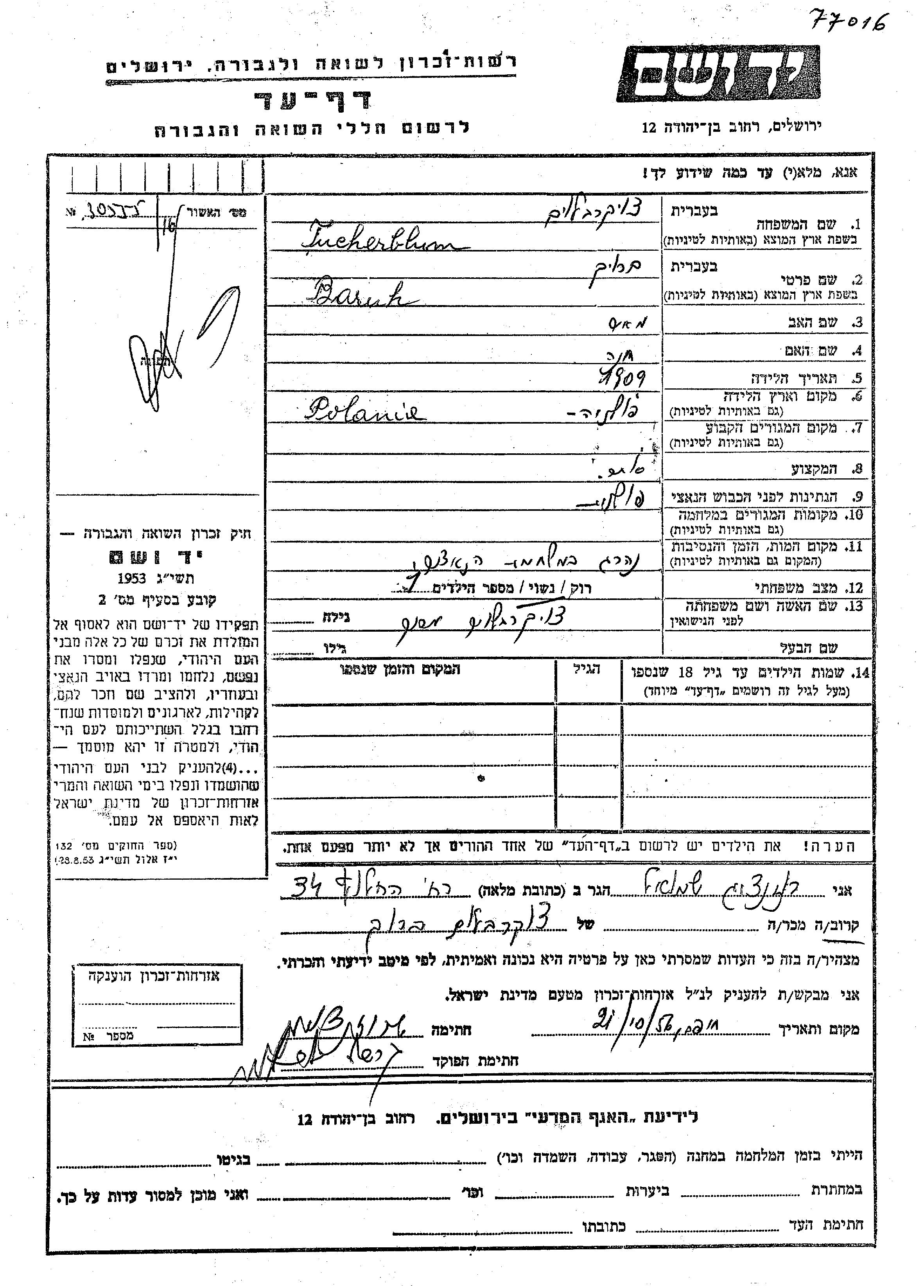 Baruh Tucherblum est né à Pologne en 1909, fils de Meir et de Khana. Il était Commerçant/e et Mariée à Miriam.