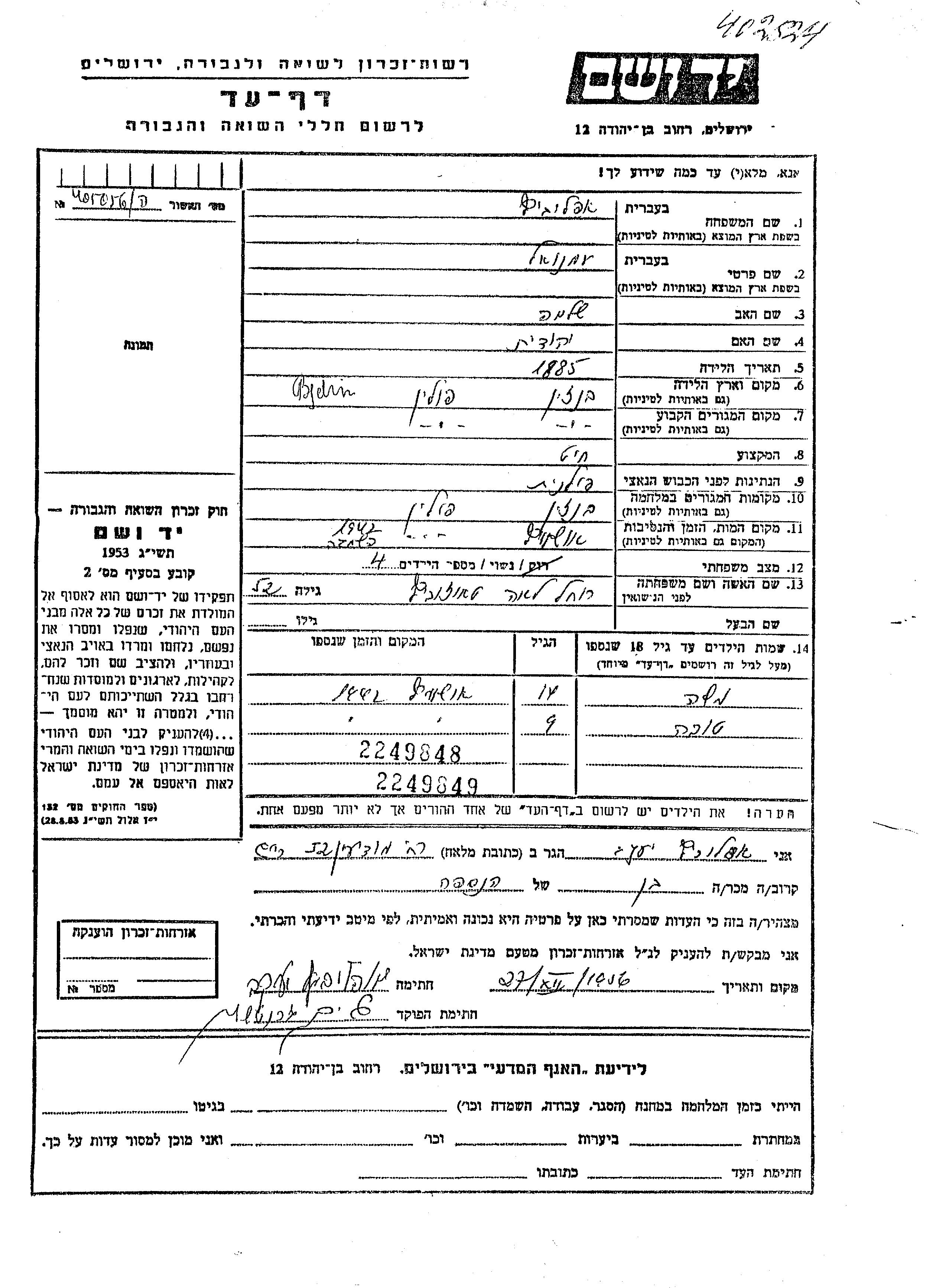 Apelowicz Moshe 1928 Będzin, Pologne Feuille de témoignage