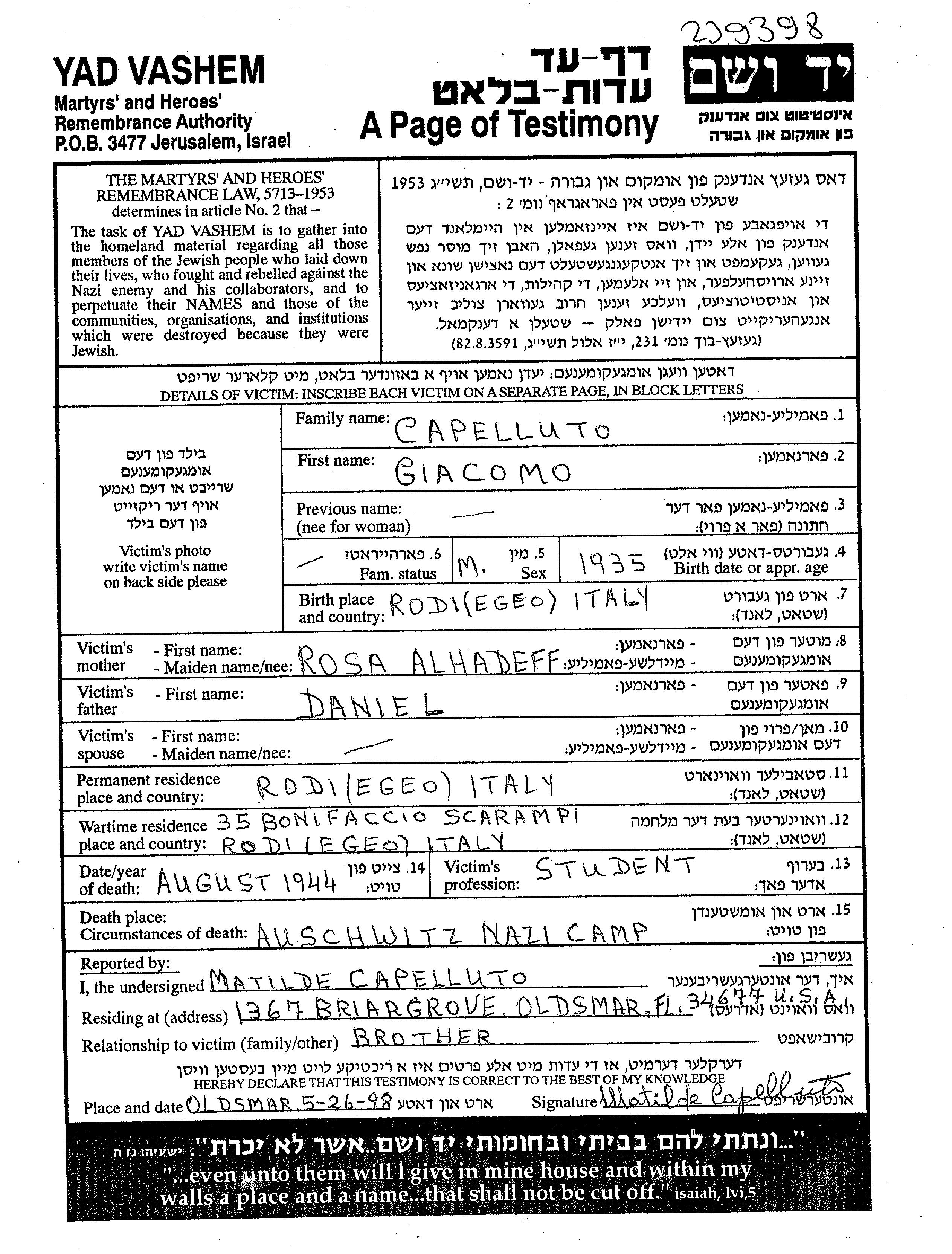 | Capelluto | Giacomo | 1935 | Rhodes, Italie | Feuille de témoignage |