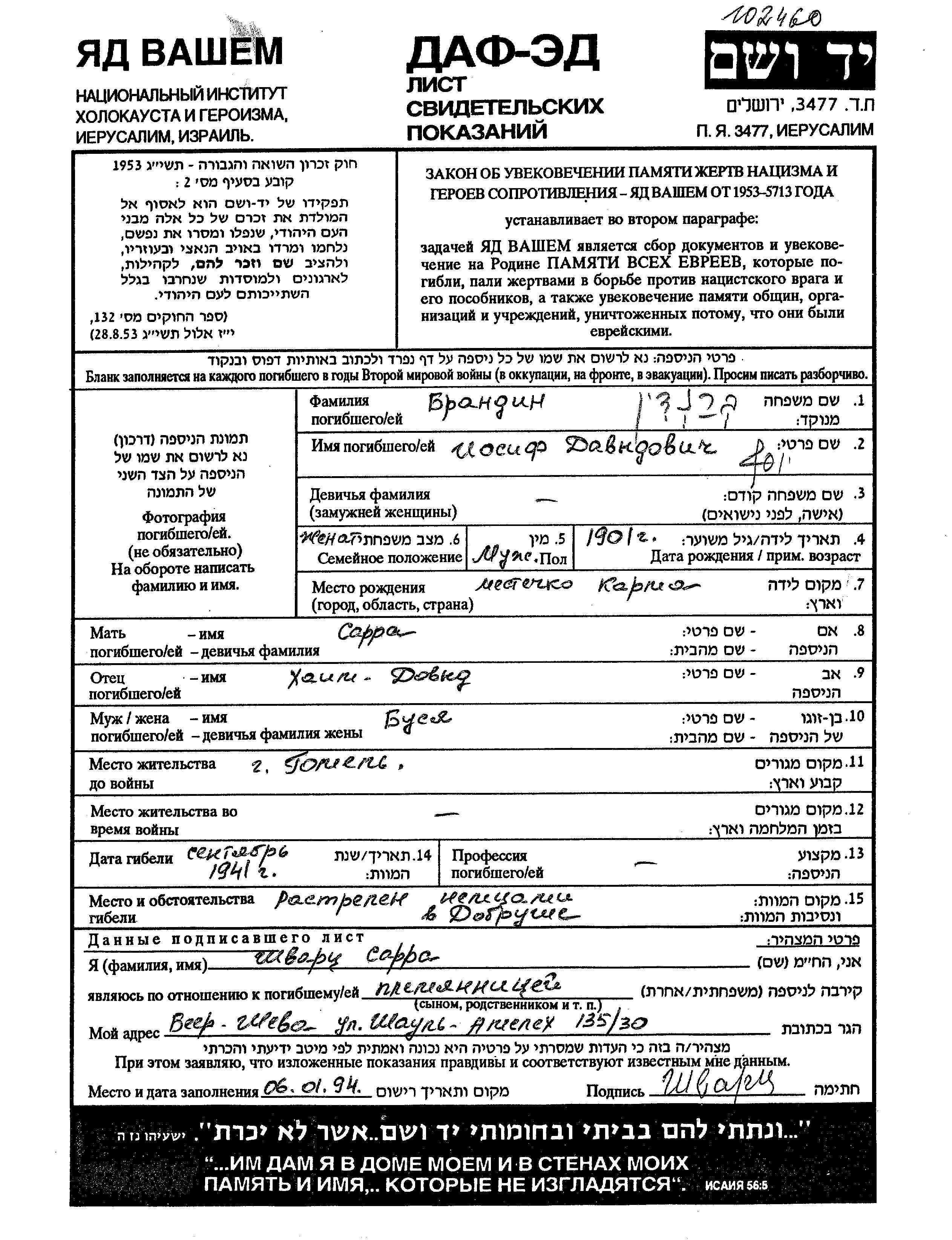 Brandin | Iosif | 1901 | Gomel, Bélorussie (URSS) | Feuille de témoignage |