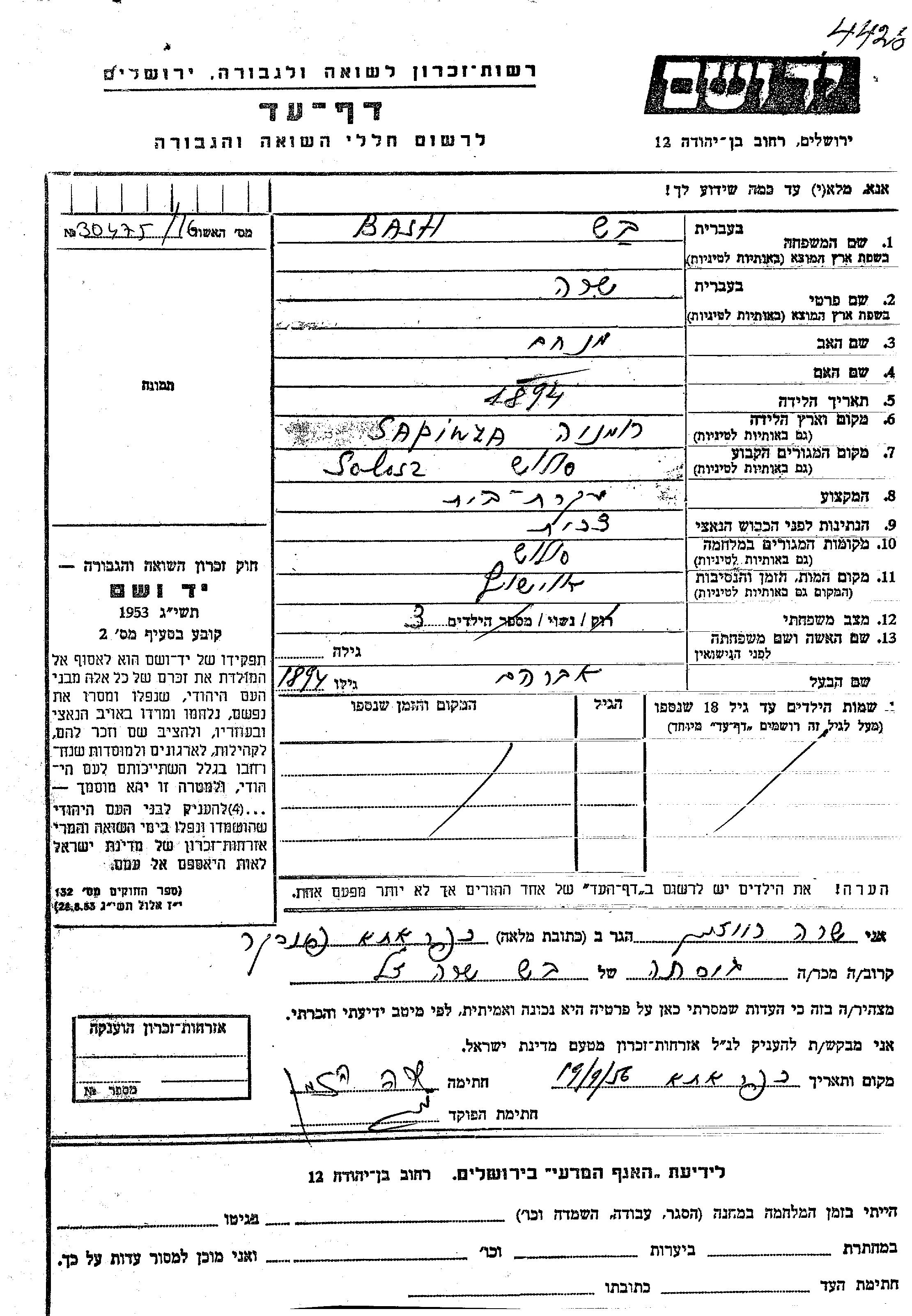 Sara Bash est née à Sapinta, Roumanie en 1894, fille de Menakhem. Elle était Femme au foyer et Mariée à Avraham. Avant la seconde guerre mondiale elle vivait à Solos, Tchécoslovaquie. Pendant la guerre, elle était à Solos, Tchécoslovaquie.